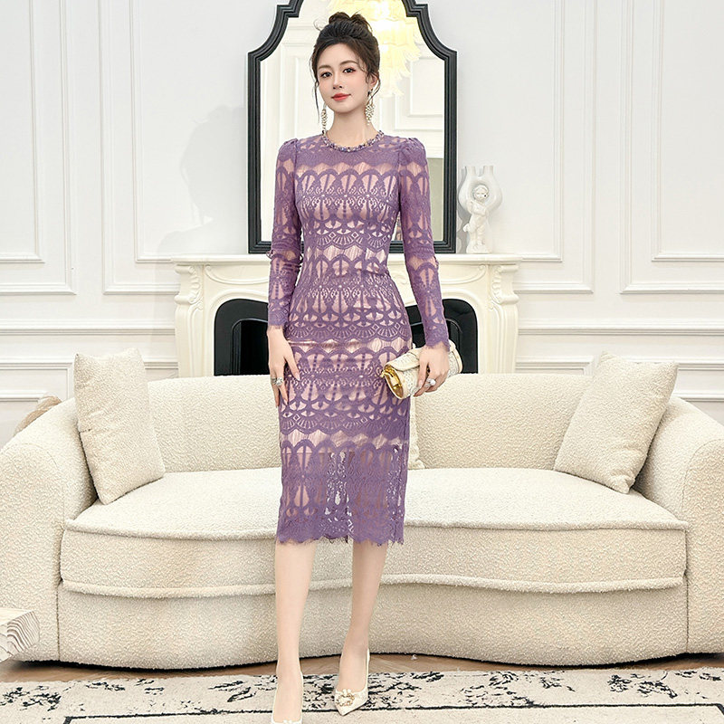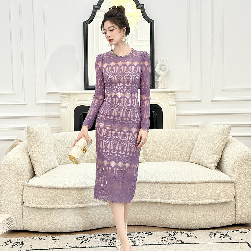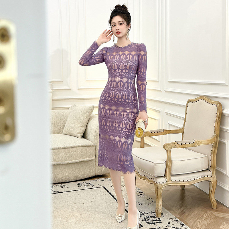 紫色性感显身材蕾丝连衣裙女装新款修身显瘦过膝中长款气质包臀裙