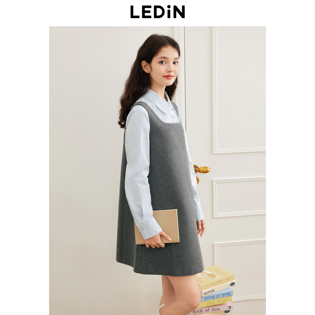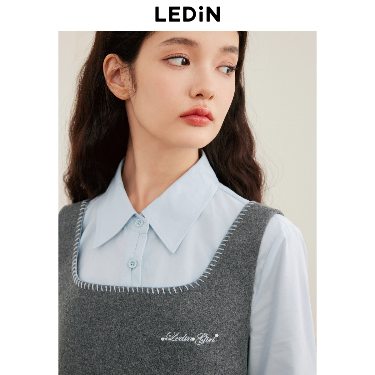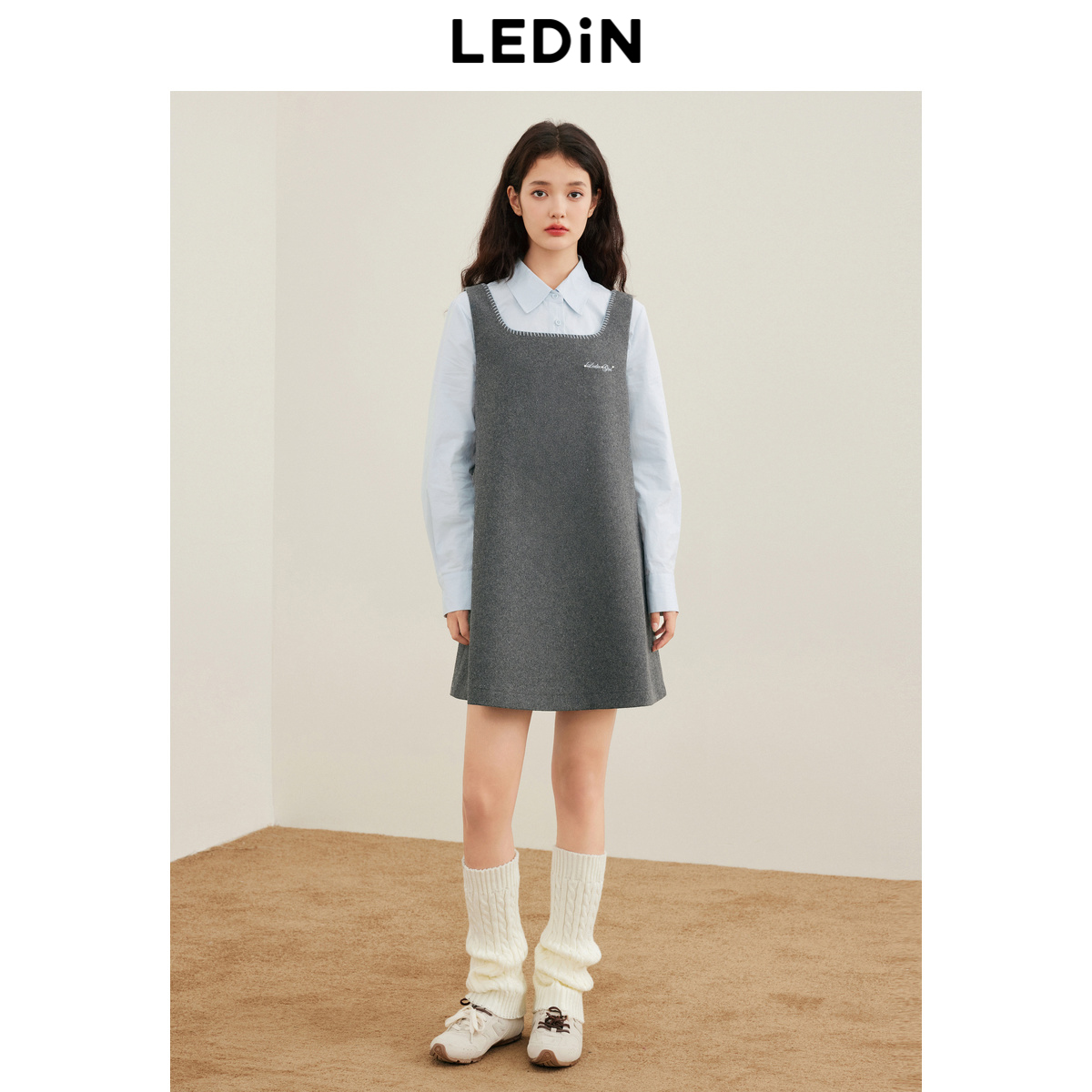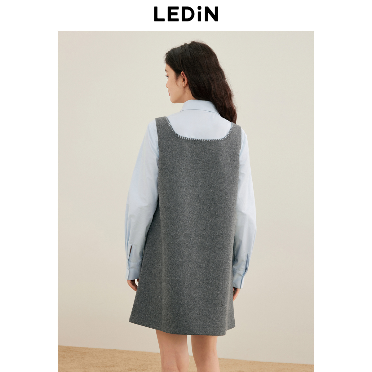 乐町撞色刺绣方领背心裙冬季新款简约A字裙简约宽松毛呢连衣裙