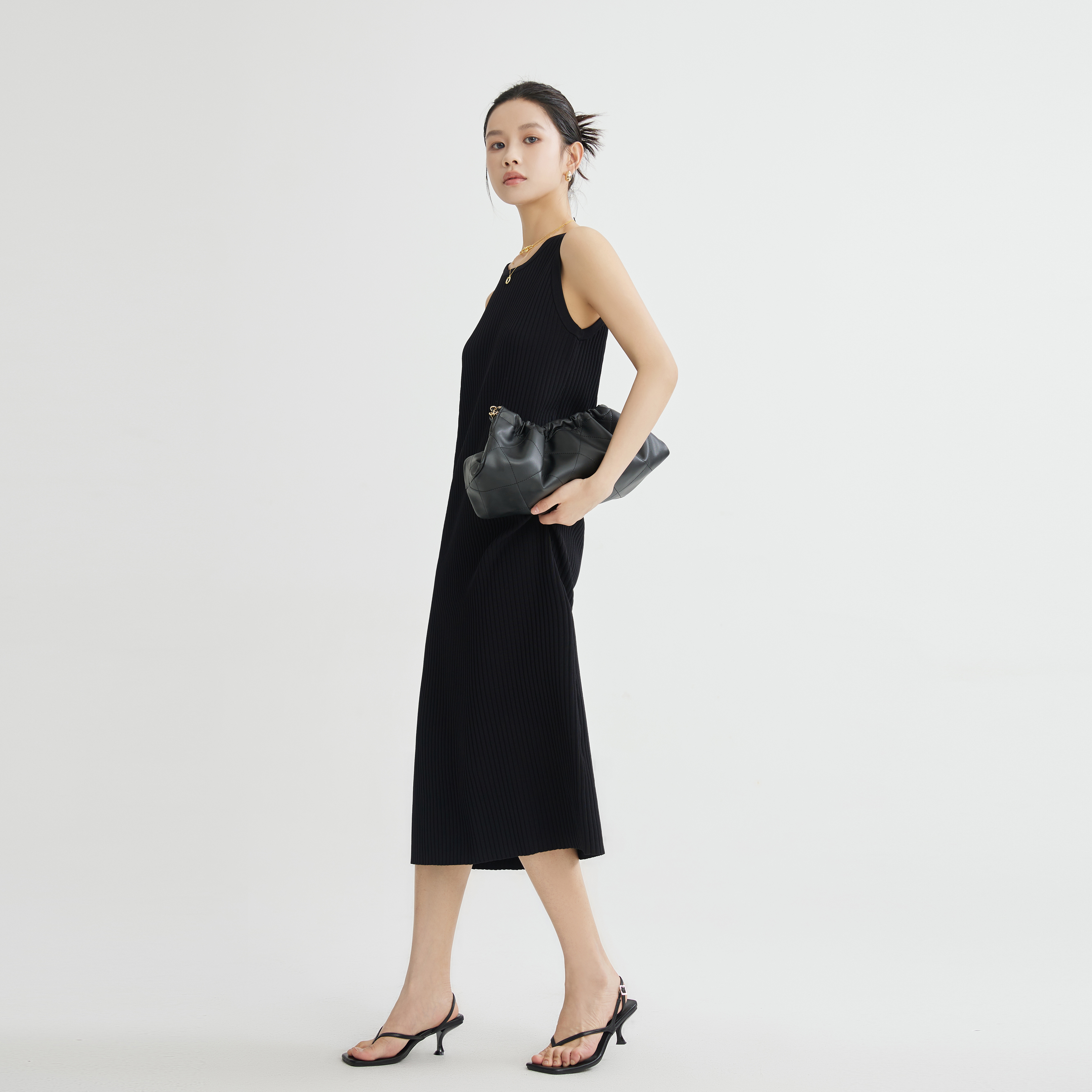 百搭坑条针织弹力背心连衣裙