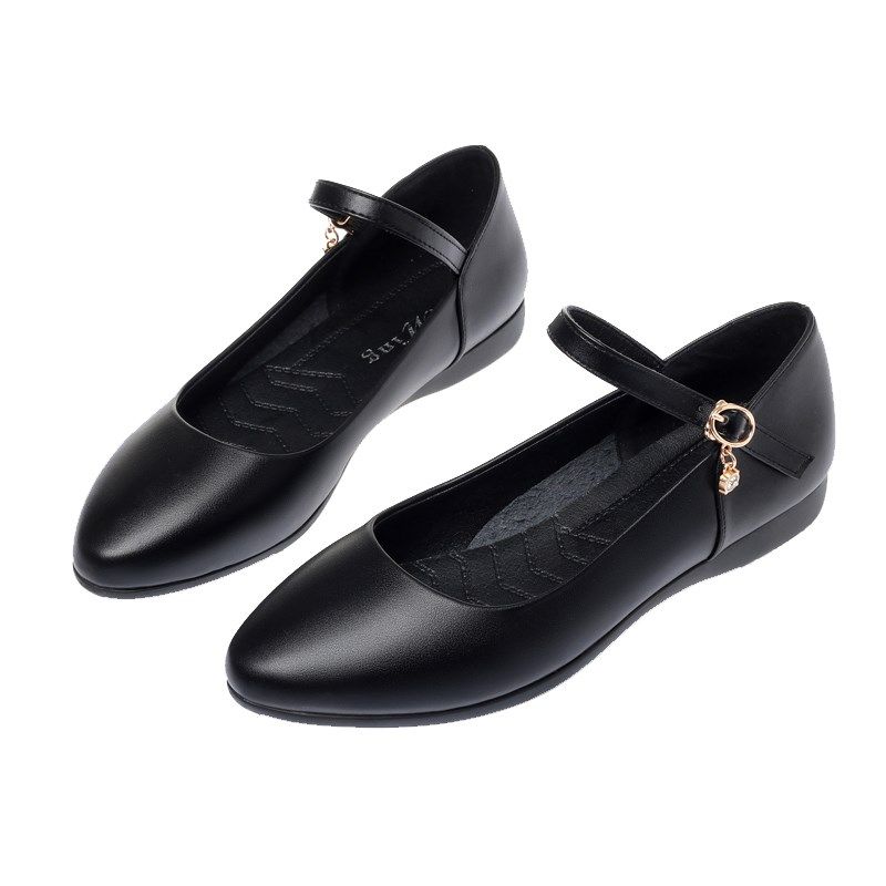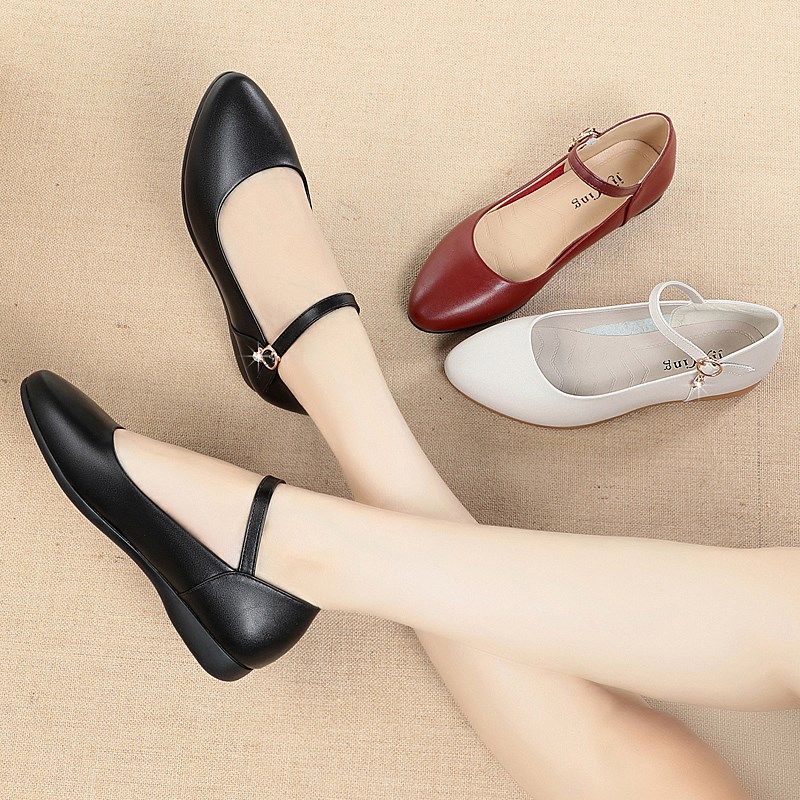 妈妈鞋单鞋真皮软底一字扣坡跟平底中老年女鞋舒适低跟舞鞋春夏季
