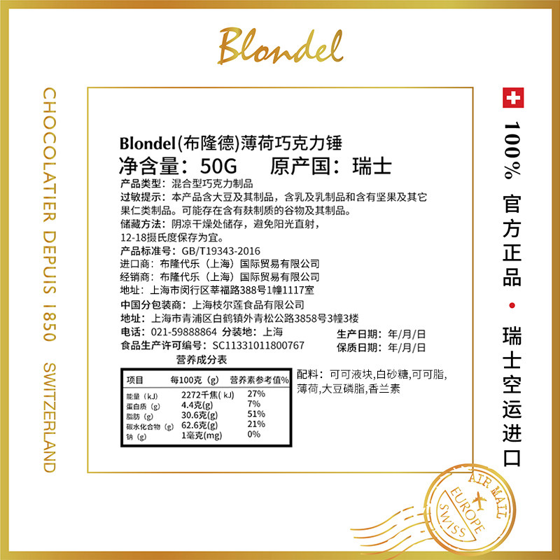 Blondel布隆德 薄荷巧克力锤 瑞士进口纯可可脂高端休闲零食糖果