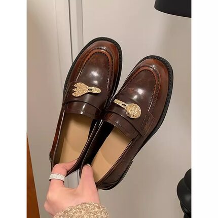 真皮法式美拉德秀气薄底小皮鞋英伦风叉勺金扣乐福鞋复古平底单鞋