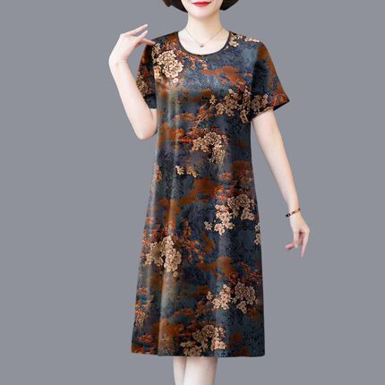 中老年妈妈装印花连衣裙2025夏季新款大码宽松短袖遮肚高档中长裙