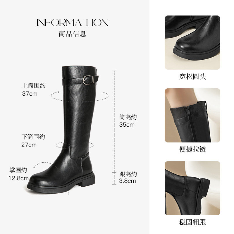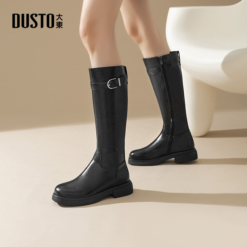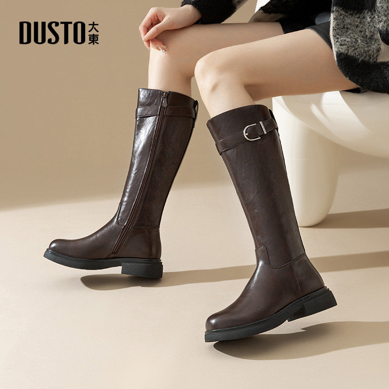 大东女鞋骑士靴2025冬季新款粗跟高筒靴皮带扣圆头不过膝长靴女靴
