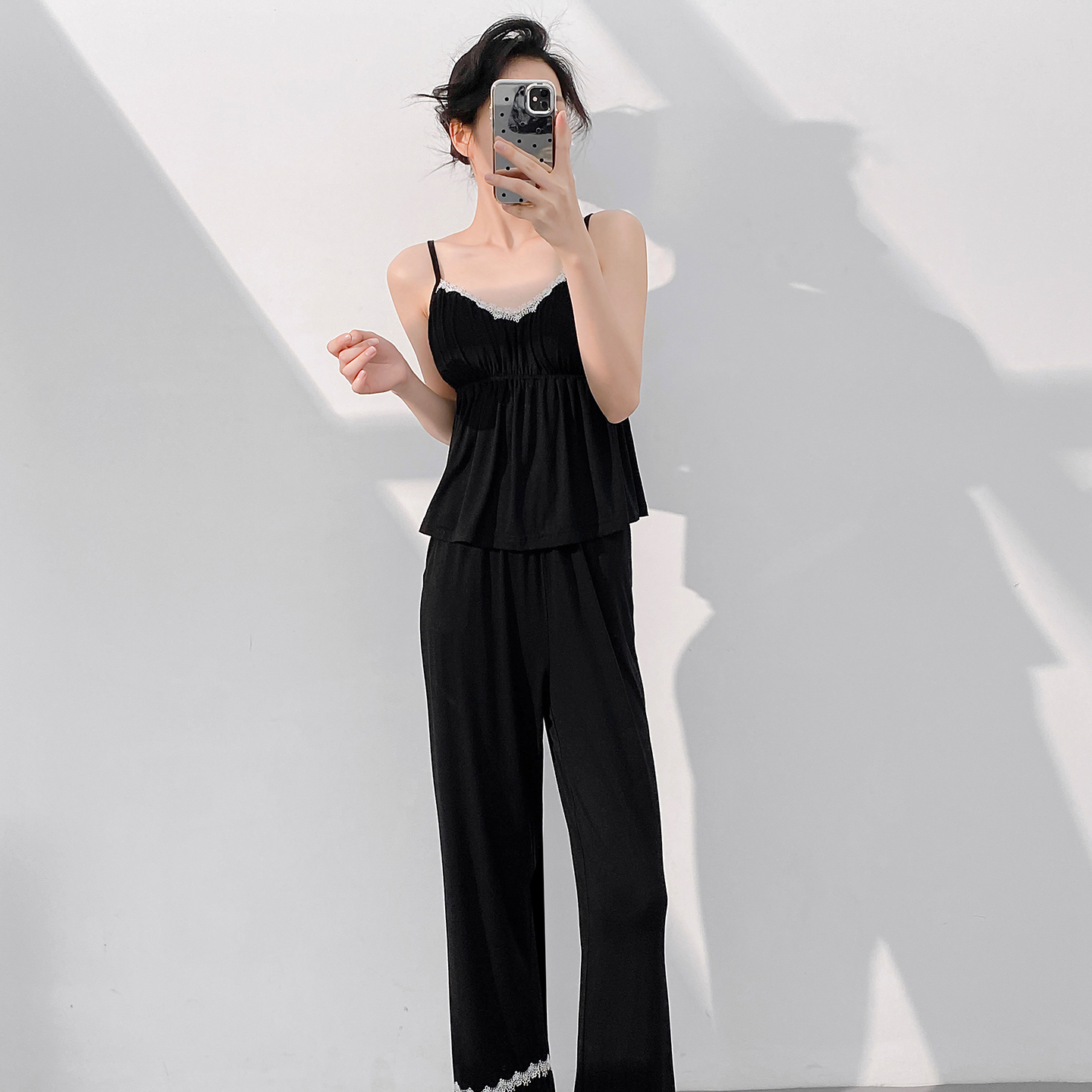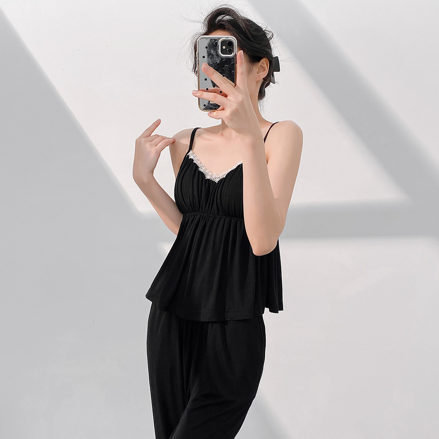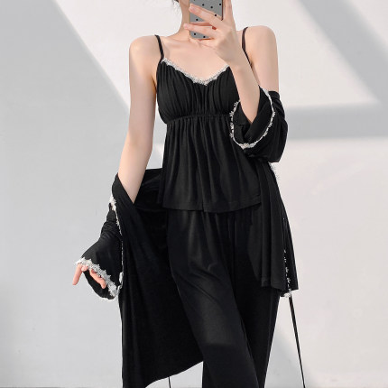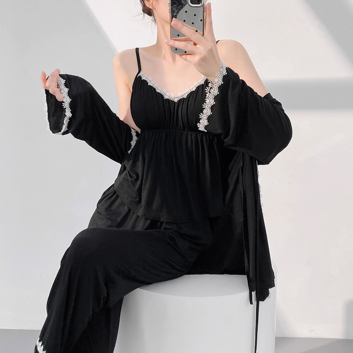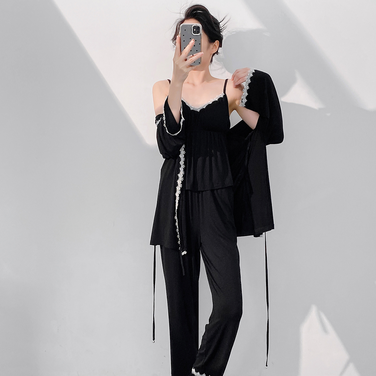 法式睡衣春秋新款性感吊带三件套带胸垫莫代尔长裤可外穿家居服女