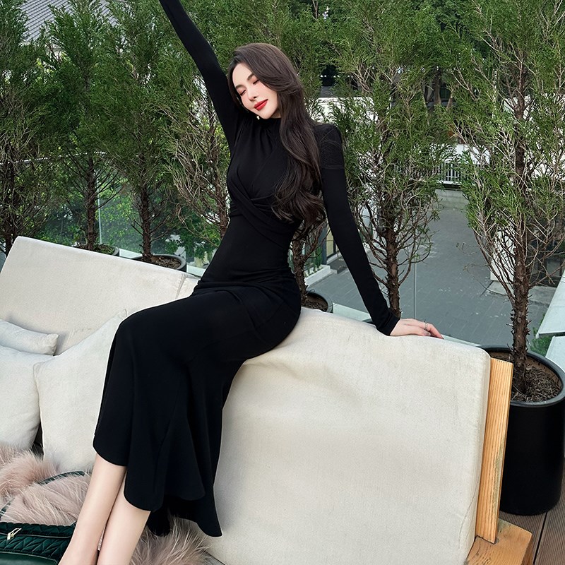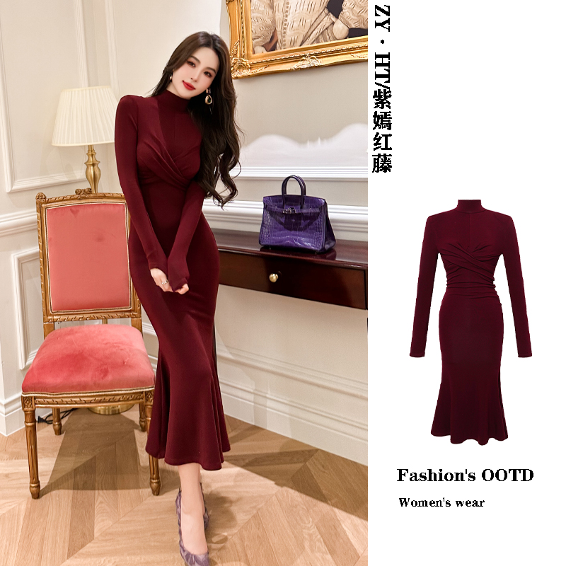 酒红色长袖高领毛衣连衣裙秋季打底包臀气质长款修身针织鱼尾裙子