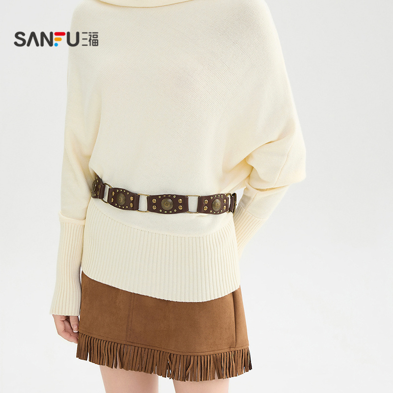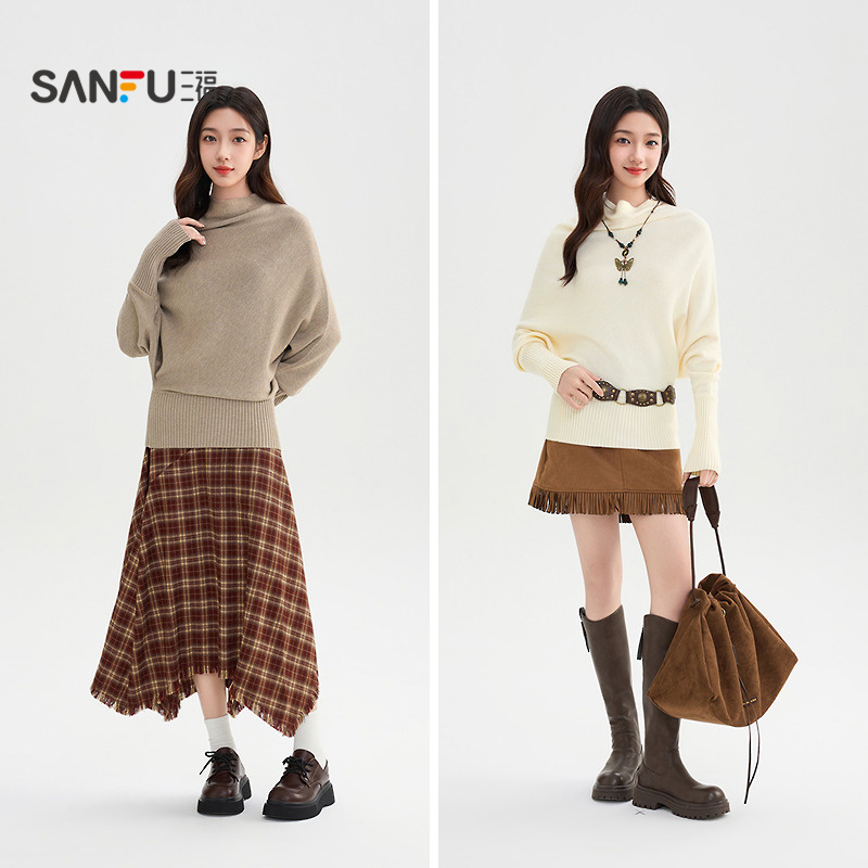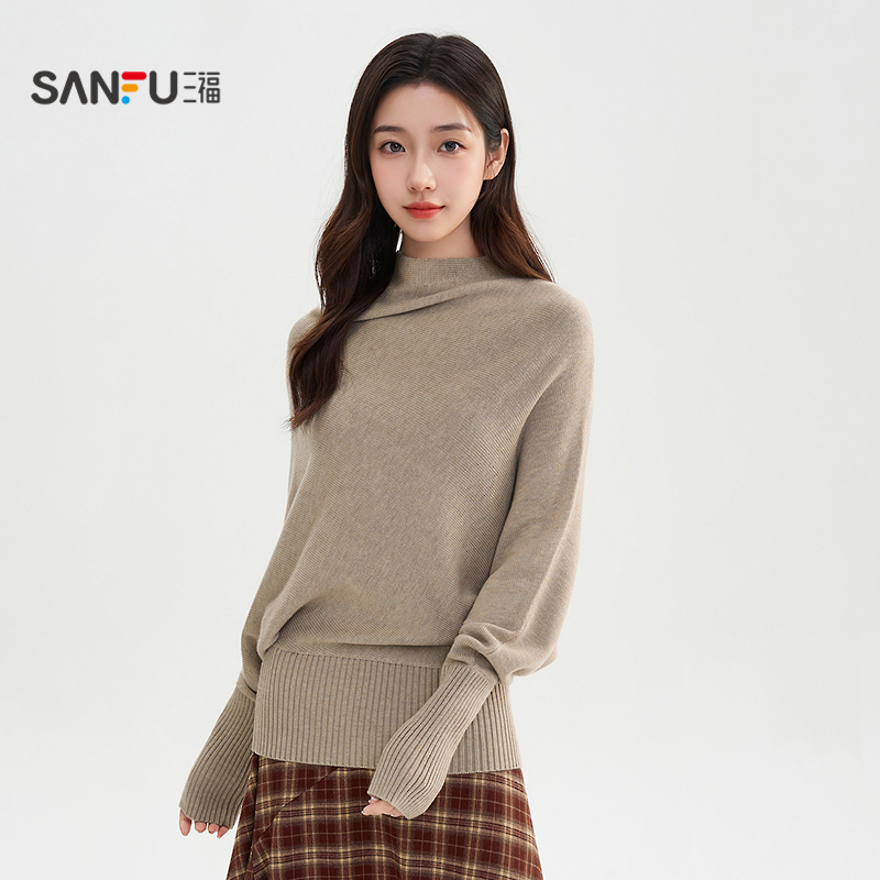 三福毛衣2025冬季简约净色堆堆领蝙蝠袖宽松上衣女装509085