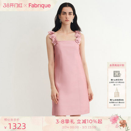 Fabrique蔷薇粉真丝绵羊毛立体花朵A字连衣裙夏小礼服裙女