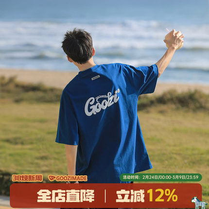 明星同款GOOZI MADE 重磅克莱因蓝短袖T恤男夏季宽松男生蓝色男款