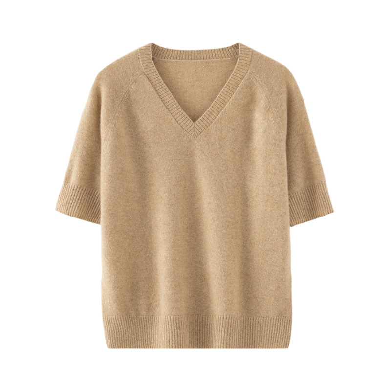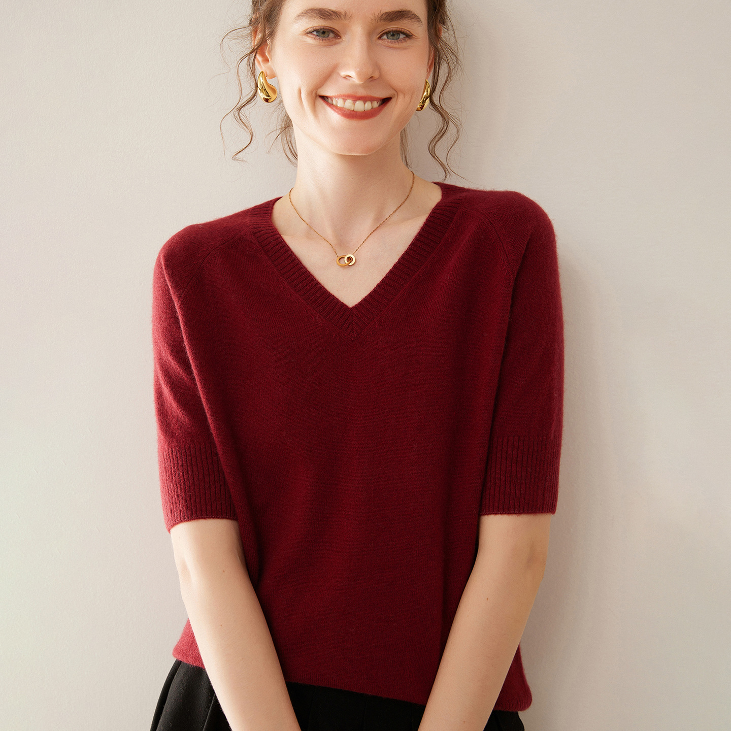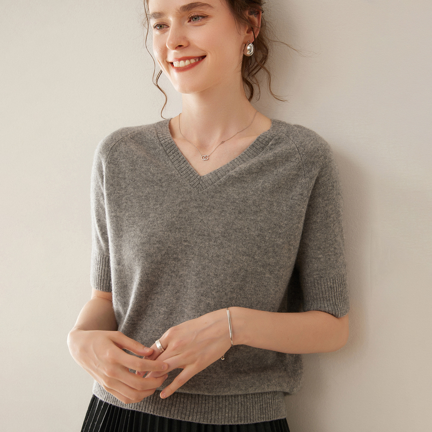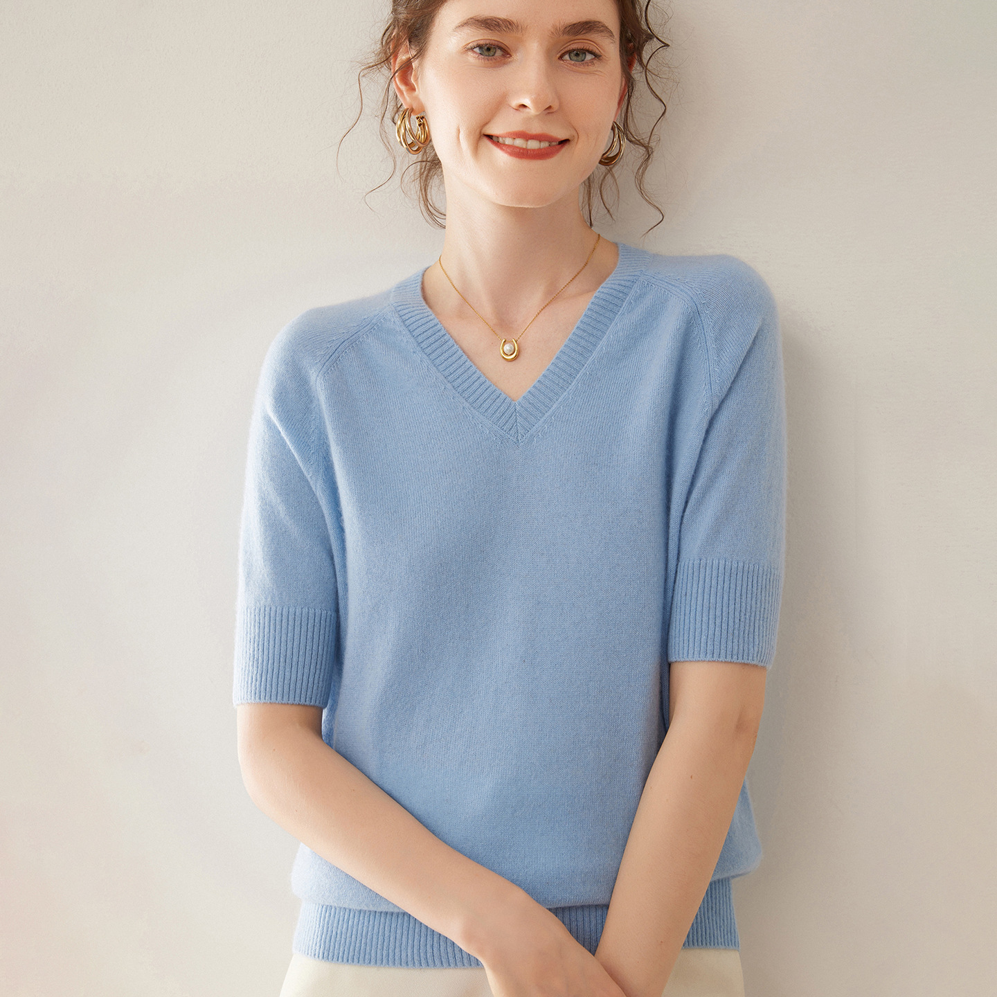 清河县特舒羊绒制品有限公司山羊绒短袖女V领毛衣纯色插肩袖羊毛