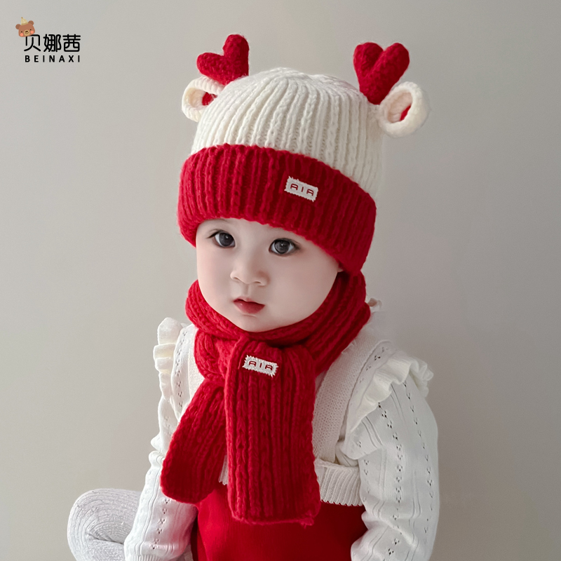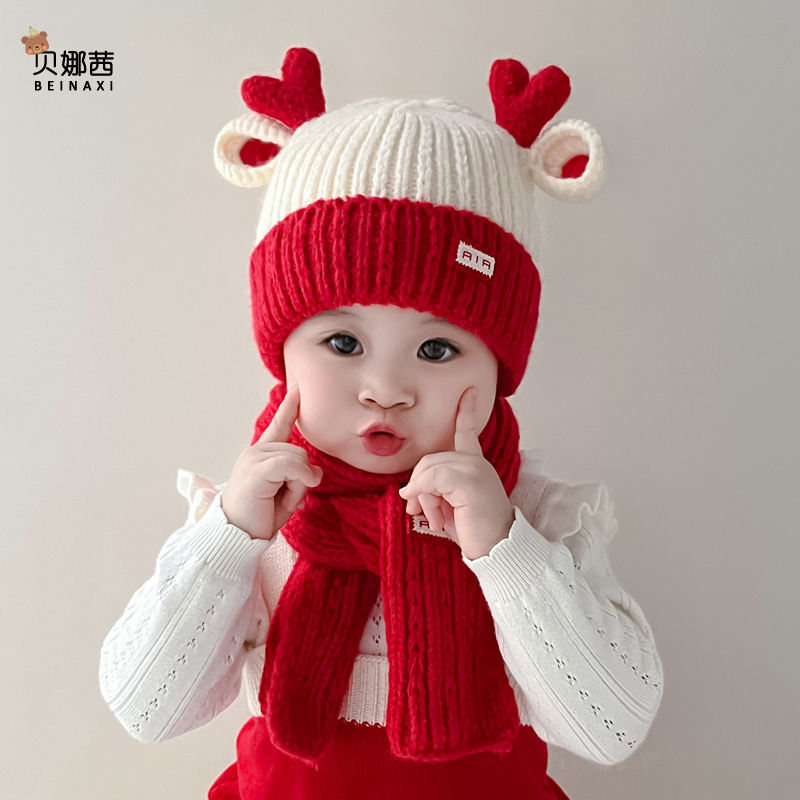婴儿帽子秋冬季宝宝女针织帽围巾儿童红色喜庆过年帽婴幼儿毛线帽
