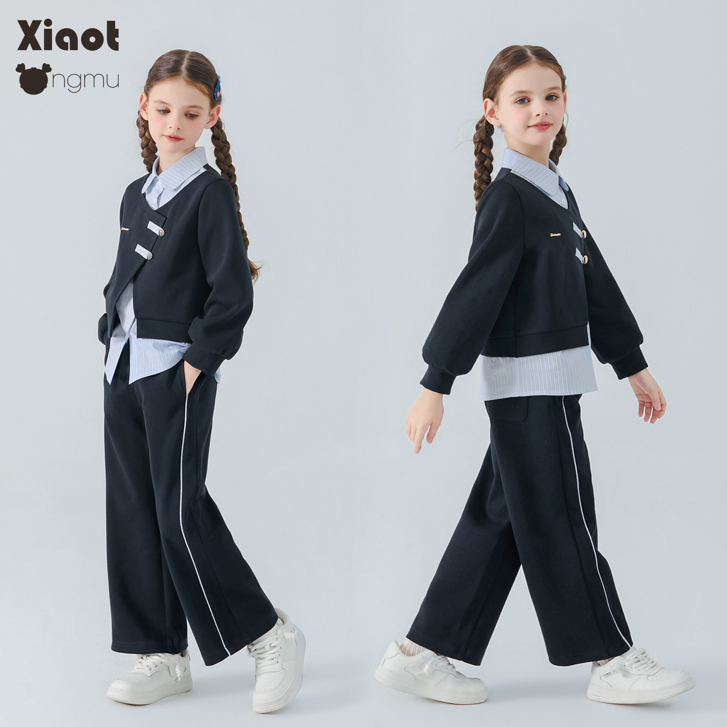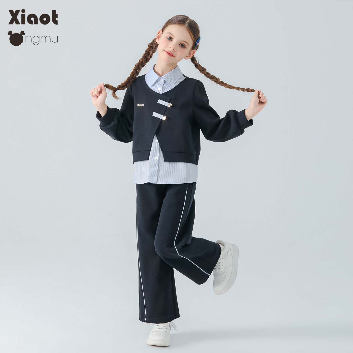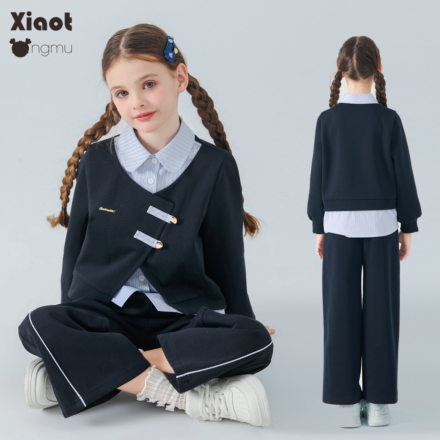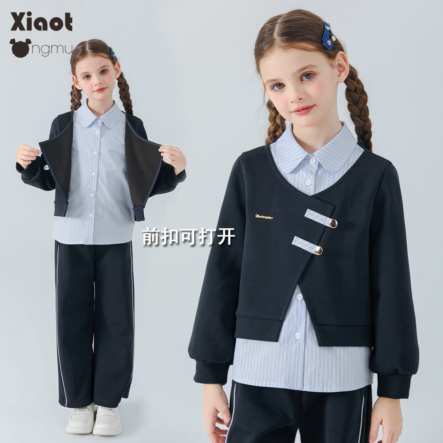 小童木 学院风女童运动套装春季新款中大童假两件条纹衬衫休闲裤