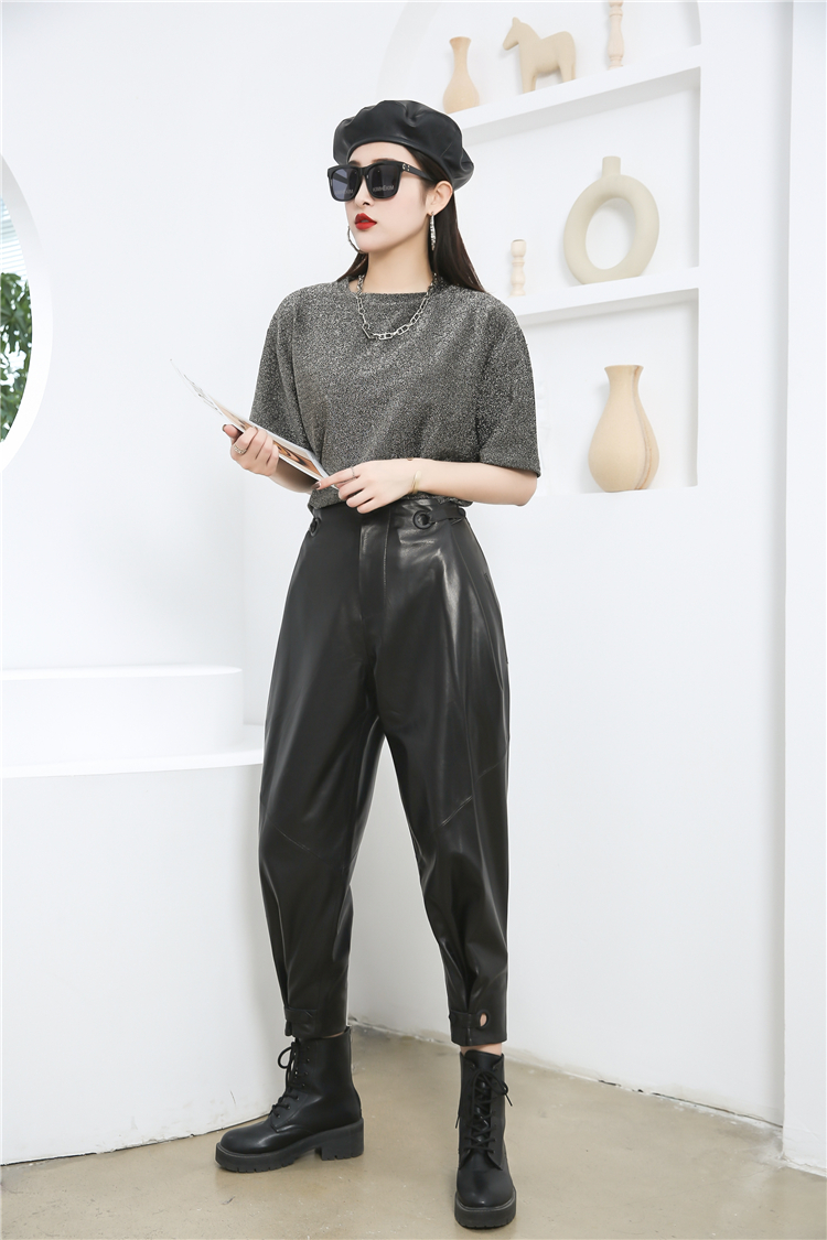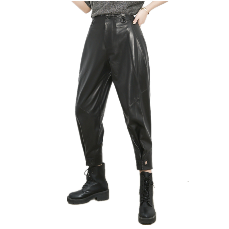 哈伦裤女2025春秋新款真皮皮裤高腰休闲萝卜裤绵羊皮小脚九分长裤