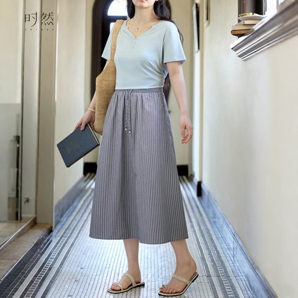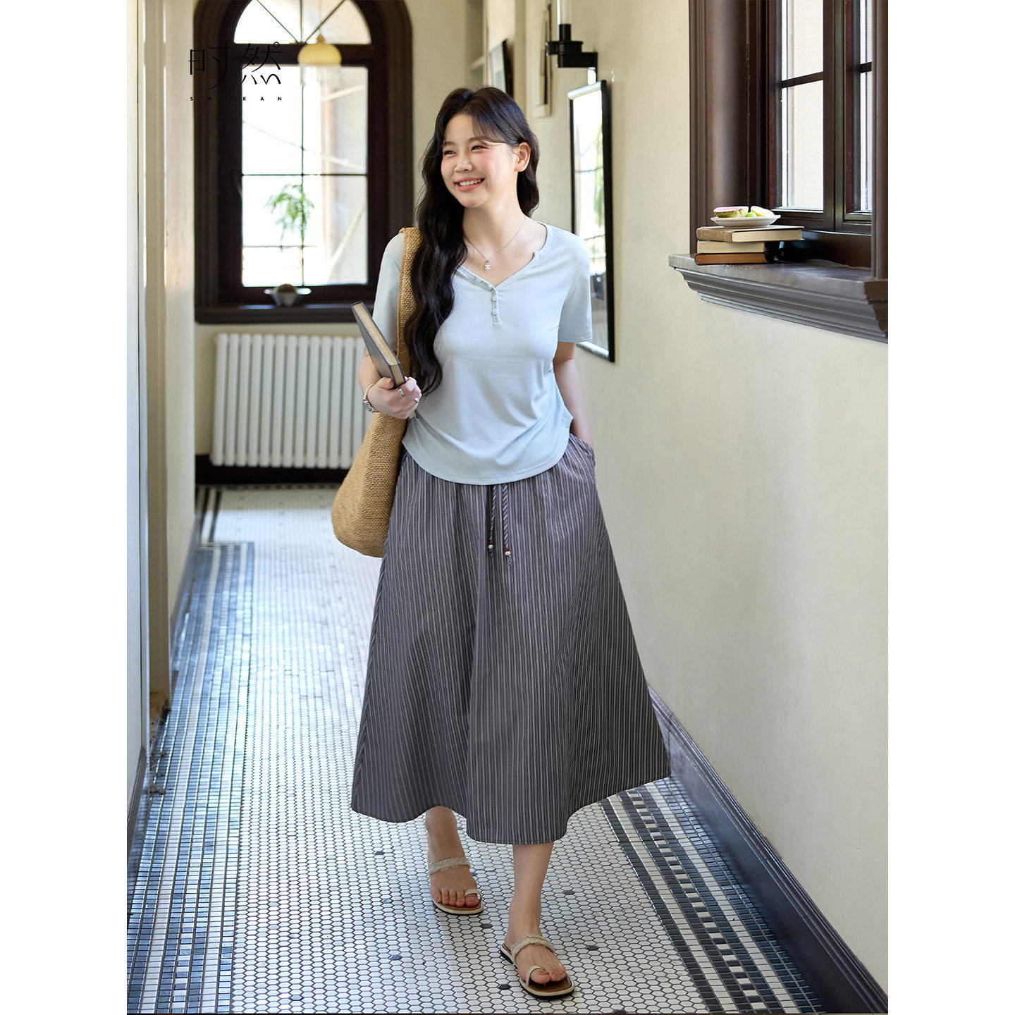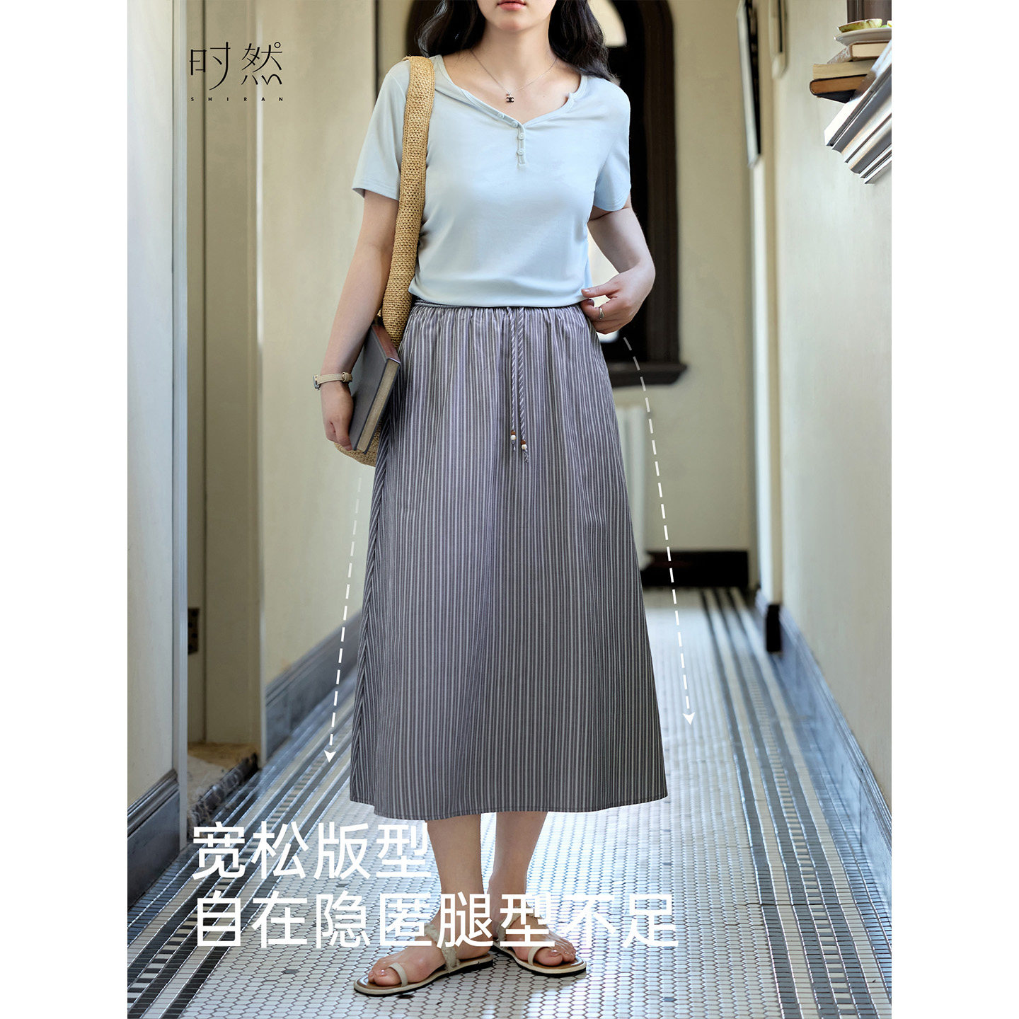 时然微胖大码女装条纹半身裙2025夏季新款松紧腰梨形显瘦遮肉伞裙