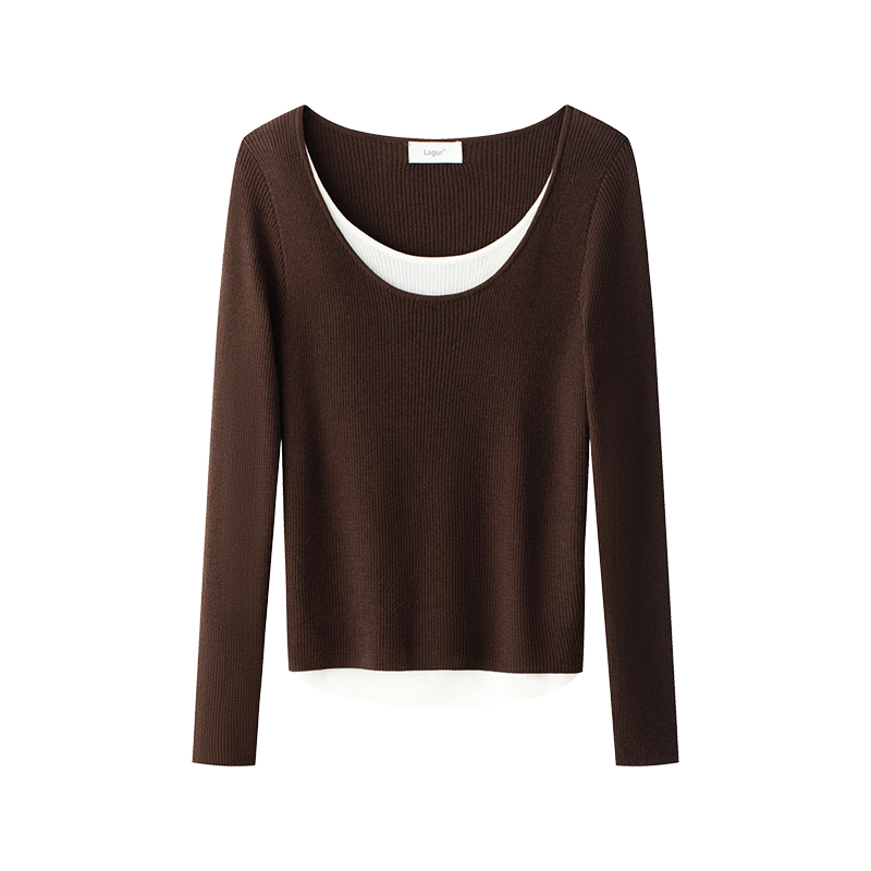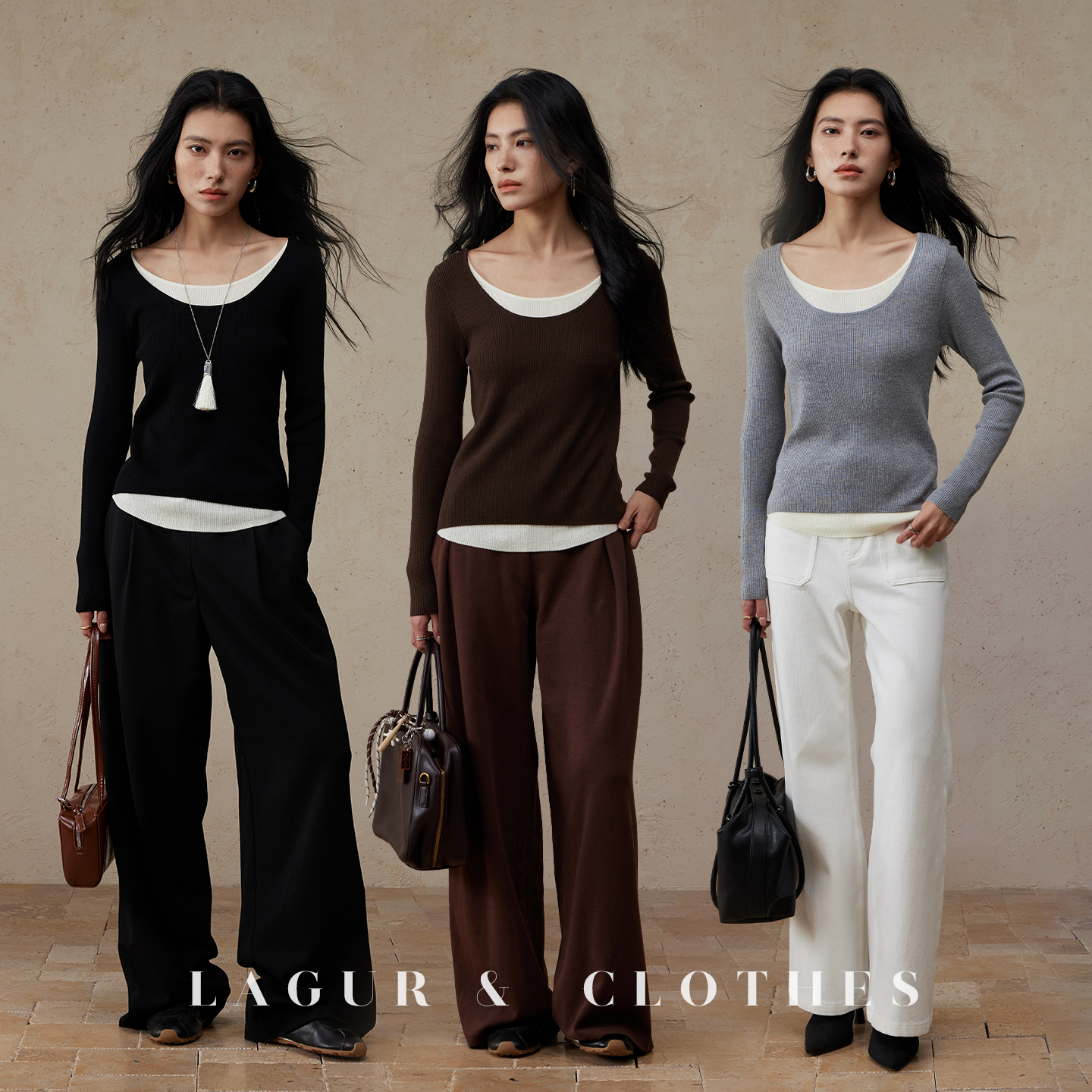 Lagur【锁骨针织衫】羊毛&羊绒显瘦圆领假两件女秋冬新款T恤上衣