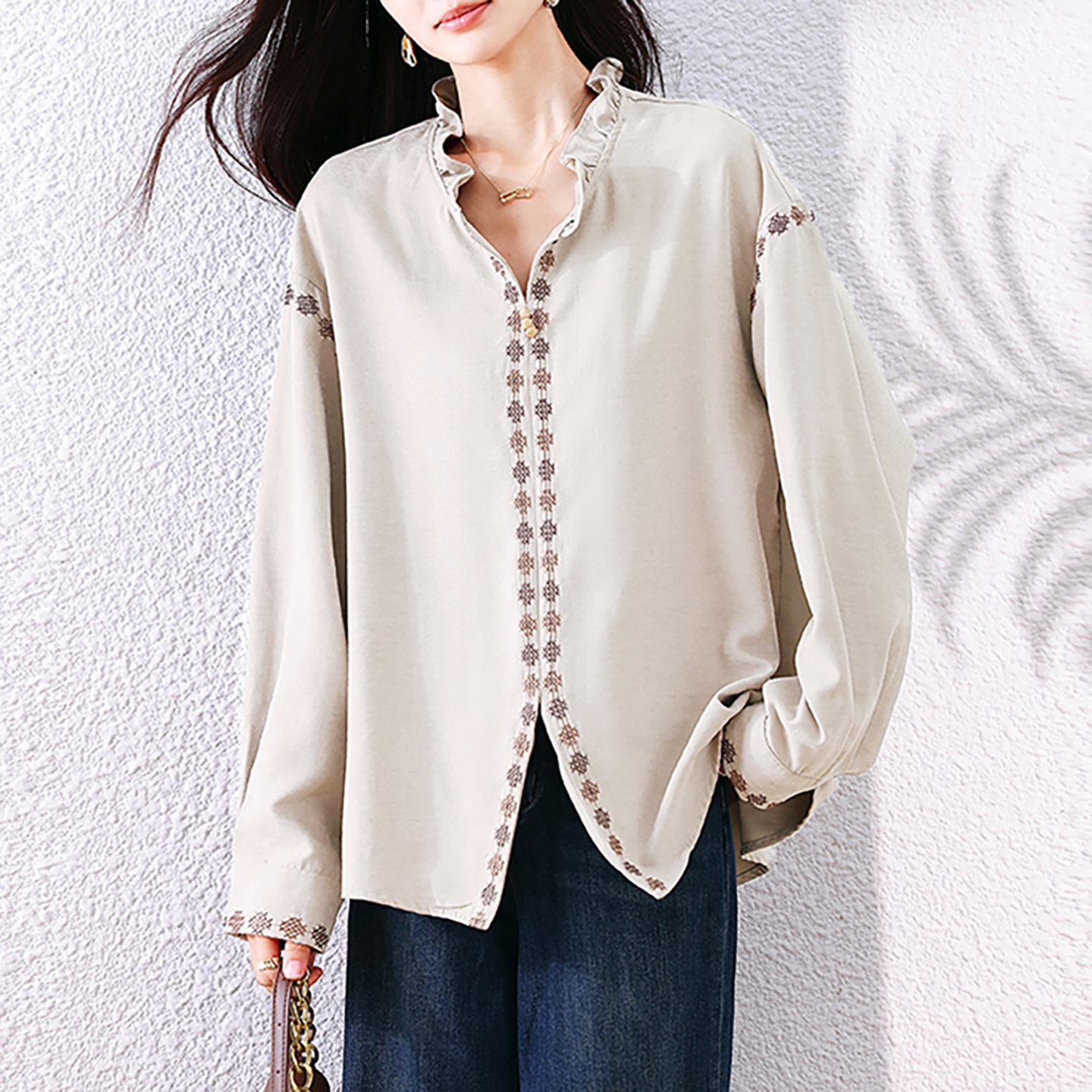 九月陌墨法式刺绣V领衬衫大码女2025秋季新款胖MM高级感长袖上衣