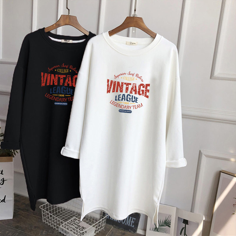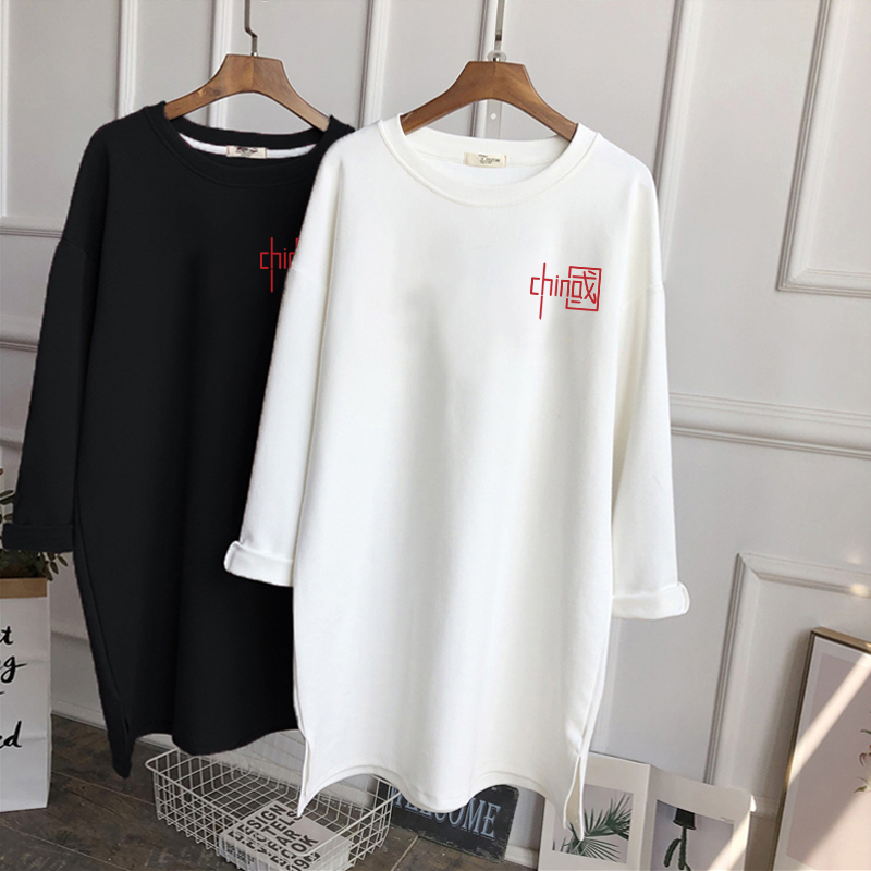 欧货中长款白色t恤女2025秋季开叉洋气纯棉磨毛加厚长袖打底内搭
