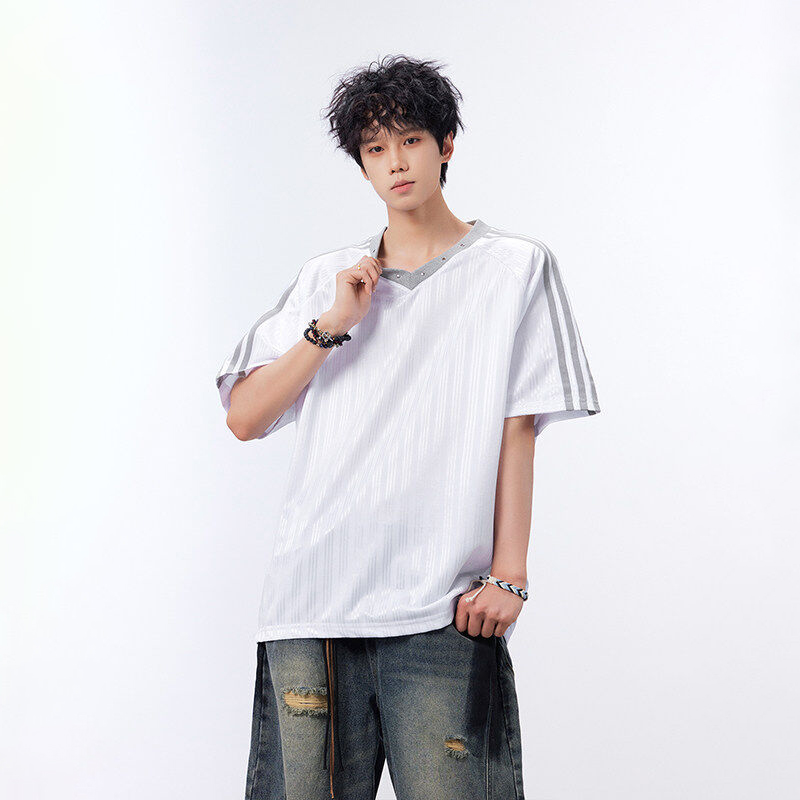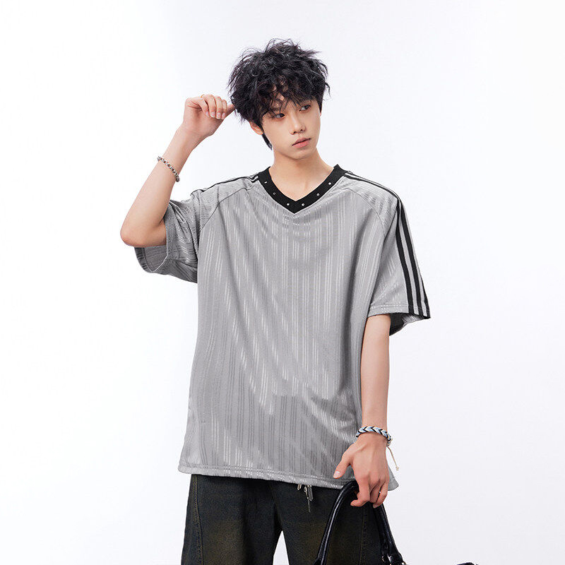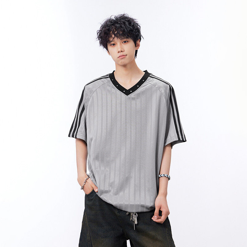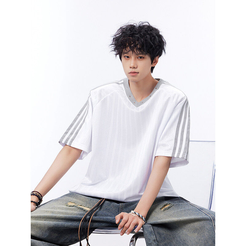 FOFWMODE 美式复古运动条纹撞色短袖T恤男拼接宽松休闲V领上衣潮