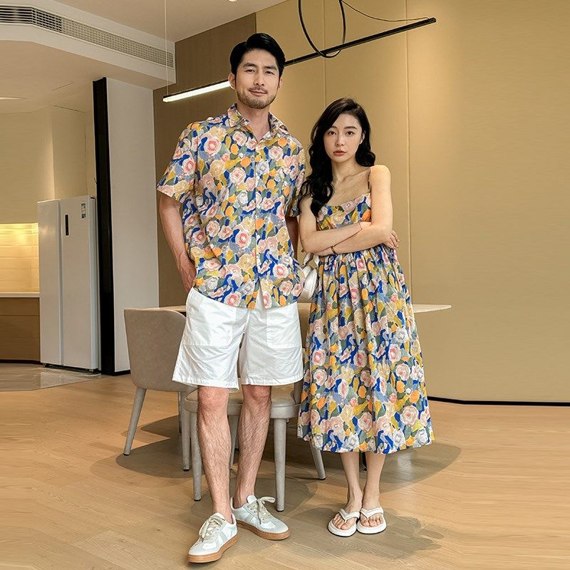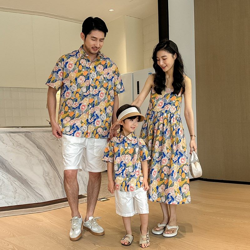 亲子装一家四口夏季母子碎花短袖花衬衫夏威夷海边度假母女连衣裙