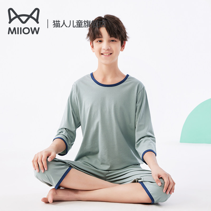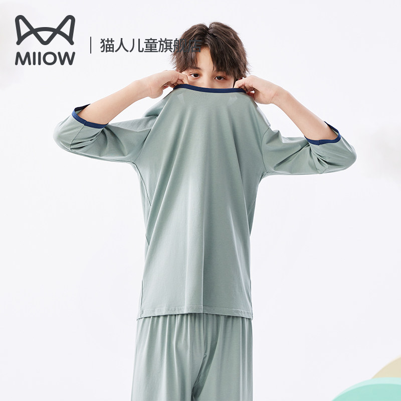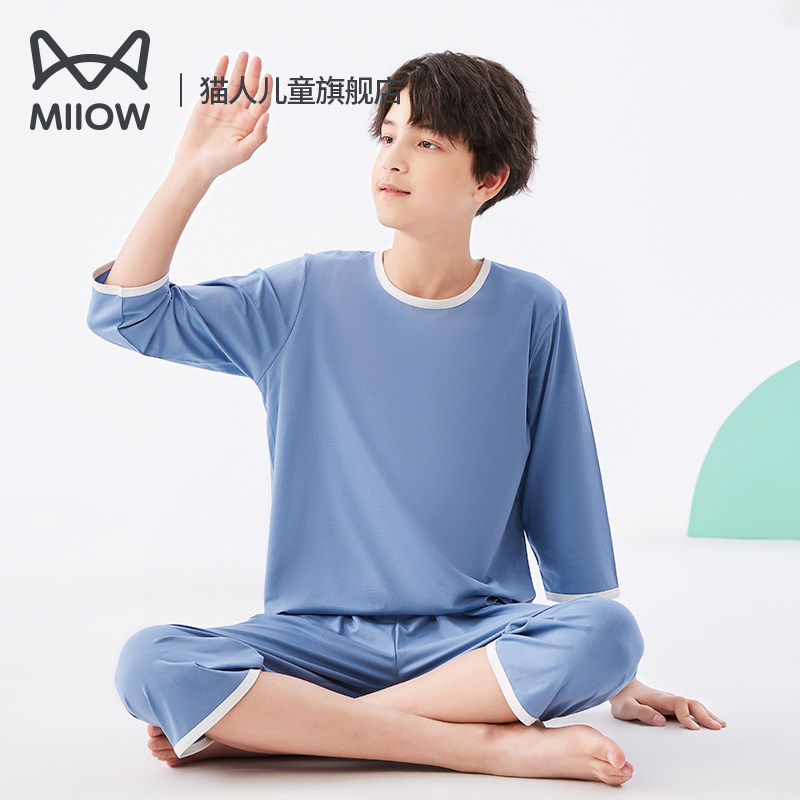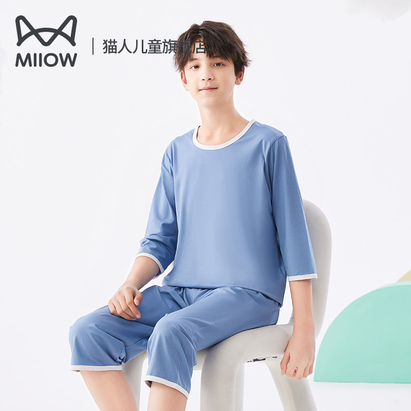 猫人儿童睡衣套装莫代尔夏大童棉质短袖家居服男童空调服薄款冰丝