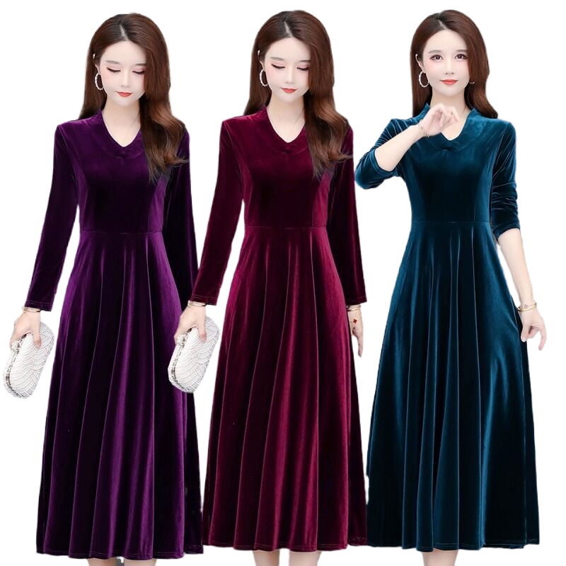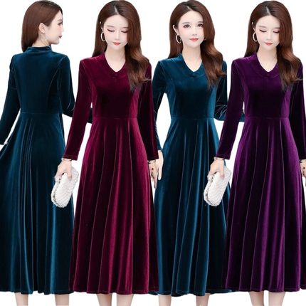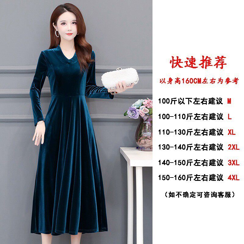 春秋冬女收腰显瘦高档金丝绒连衣裙子妈妈大摆裙长裙打底裙a字裙