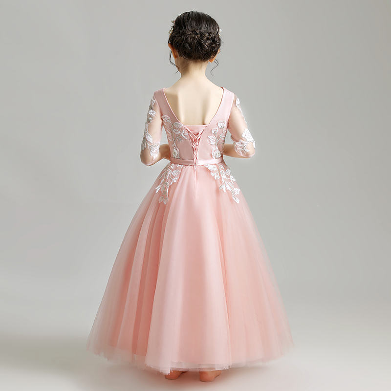 女童晚礼服公主裙儿童婚纱中袖蓬蓬纱小孩花童主持人绑带粉色轻奢