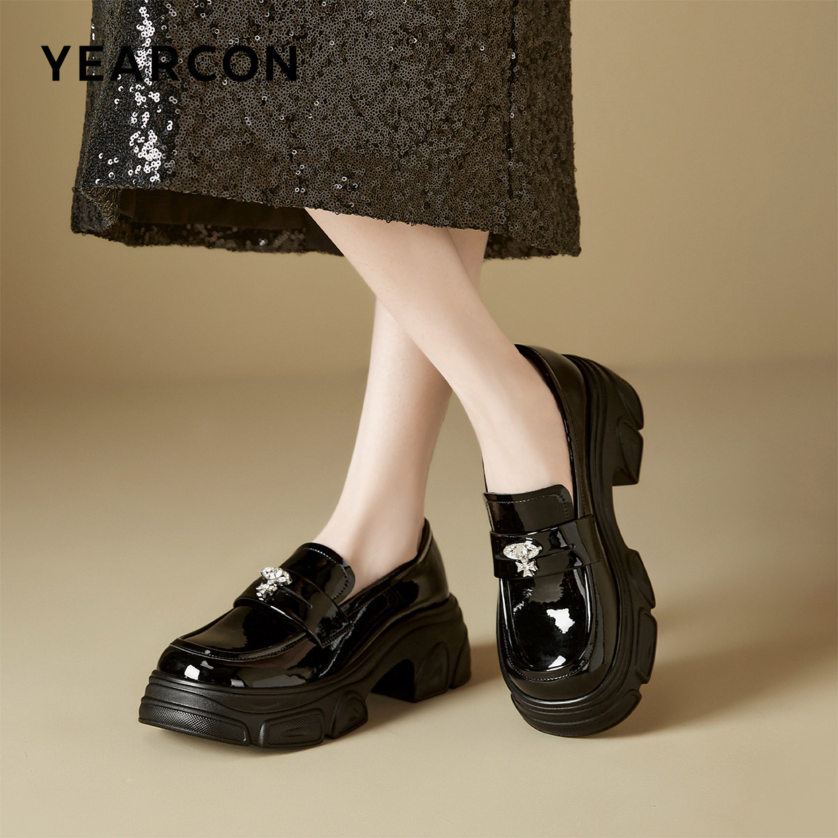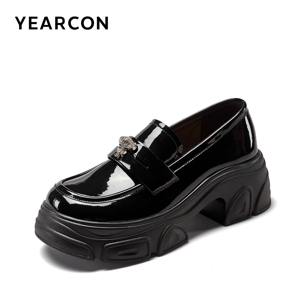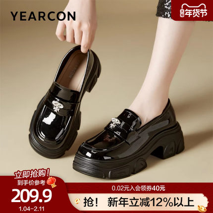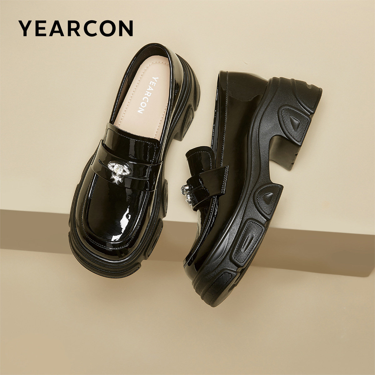 意尔康厚底乐福鞋女2026春季黑色英伦风增高小皮鞋粗跟水钻扣单鞋