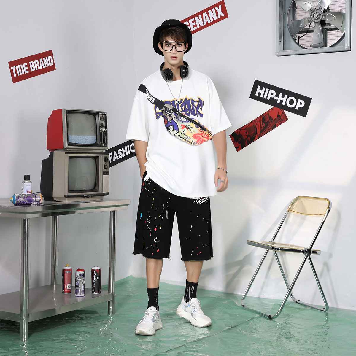 GENANX闪电潮牌包包短袖上衣男胸包印花T夏拉链衣服男原创多彩t恤