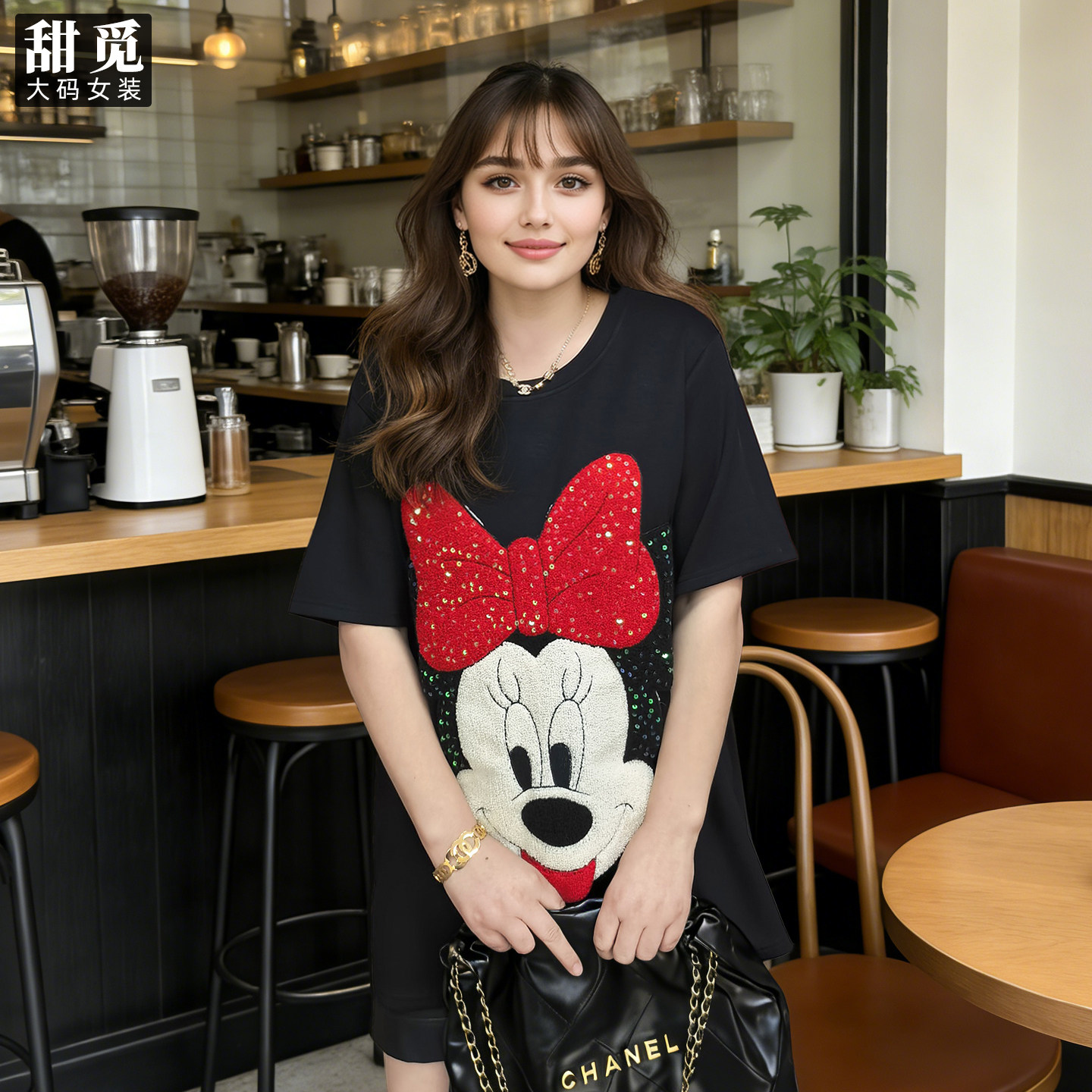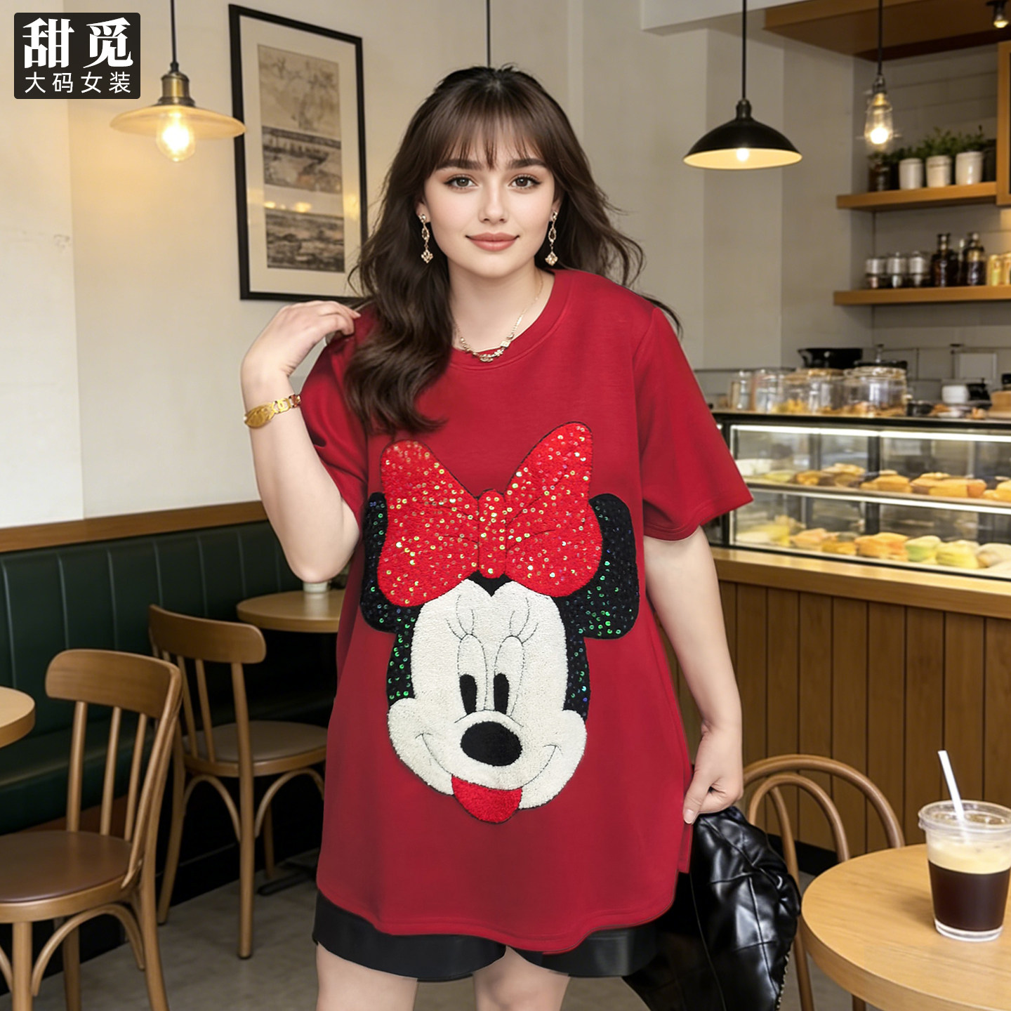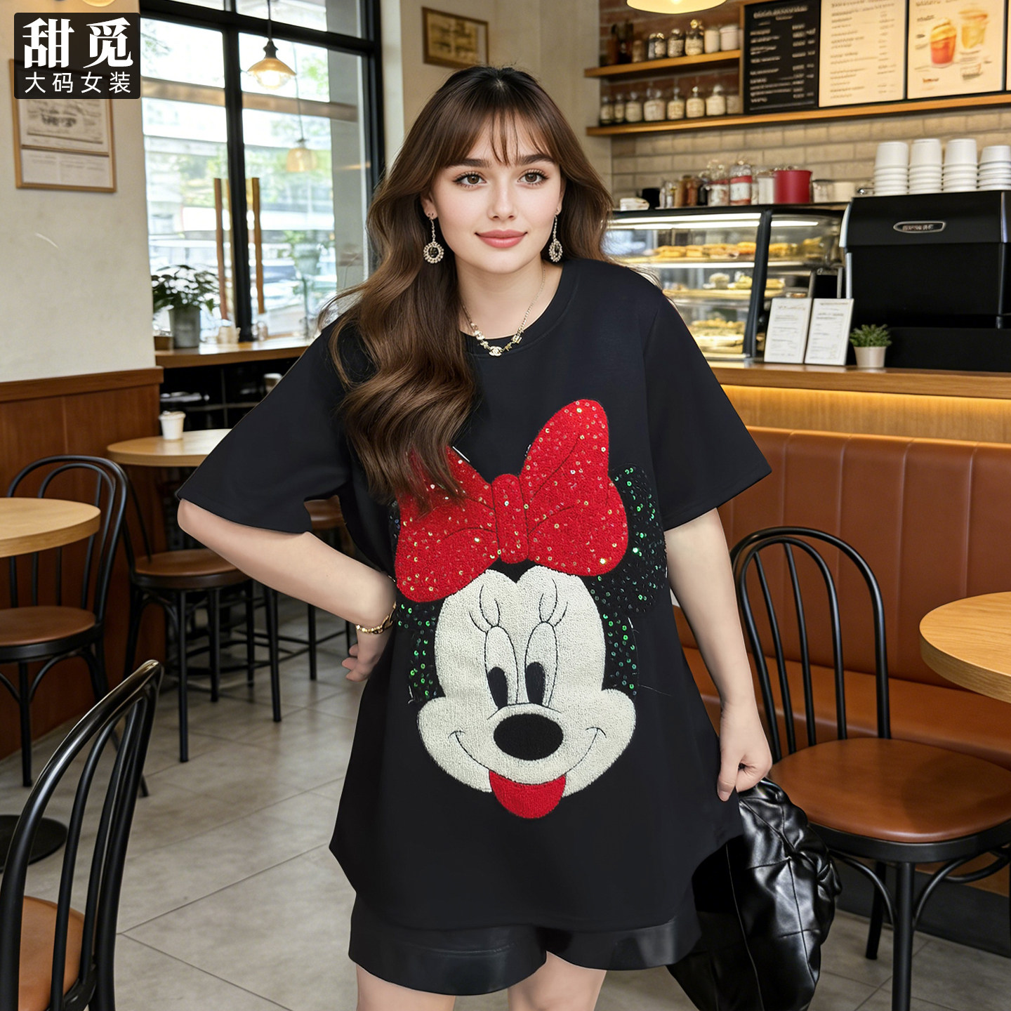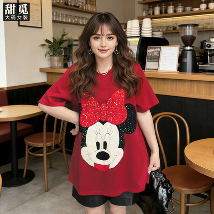 甜觅特大码女装春夏装胖mm300斤可爱米妮重工珠片刺绣长款短袖T恤