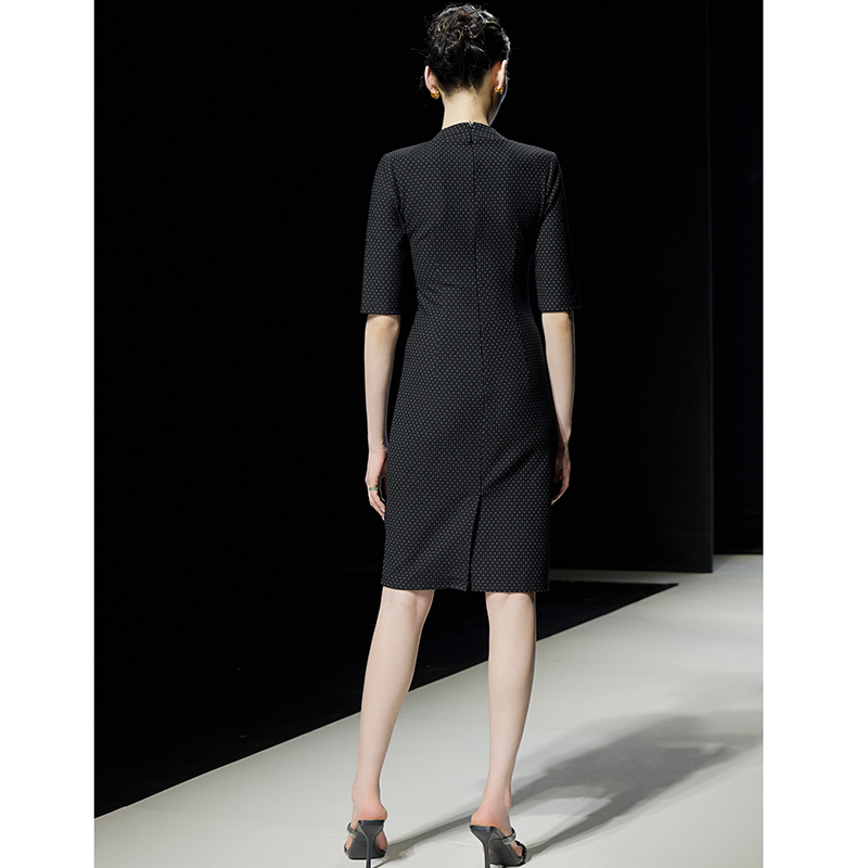 2025秋新款通勤职业立领修身包臀西装裙中袖波点小黑裙女装连衣裙