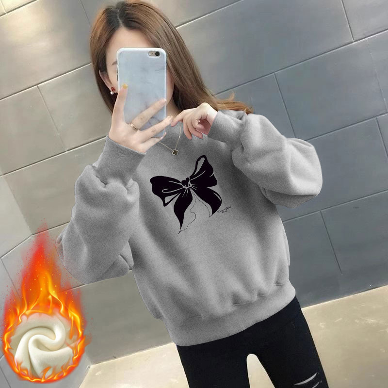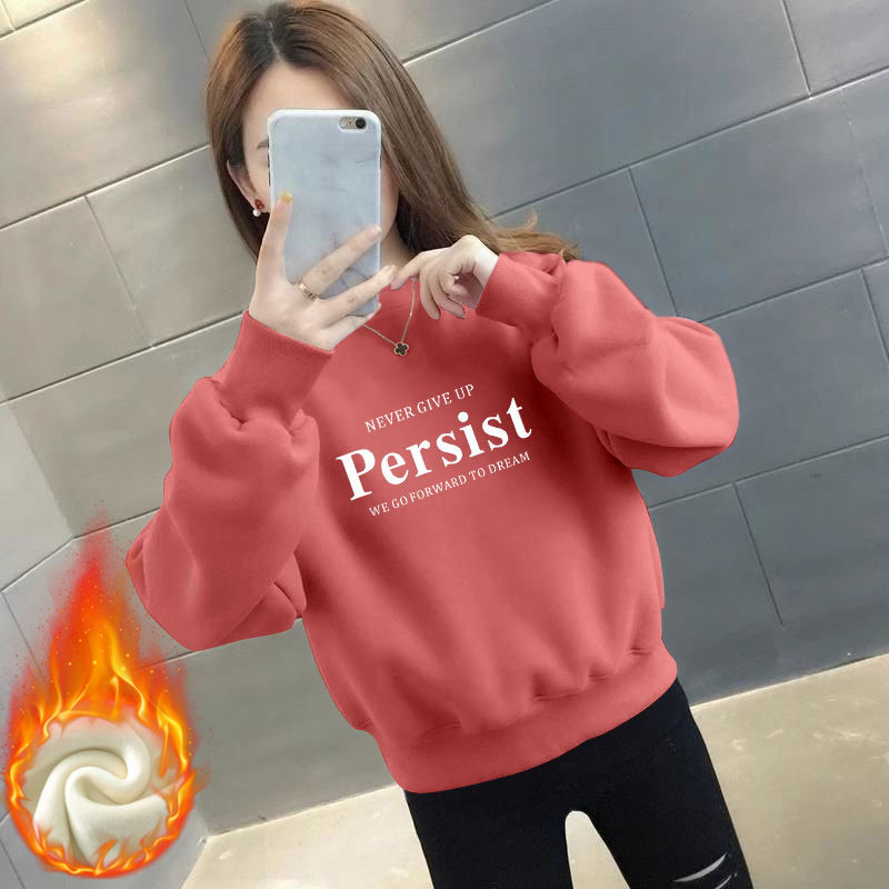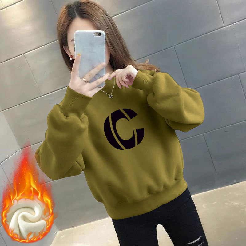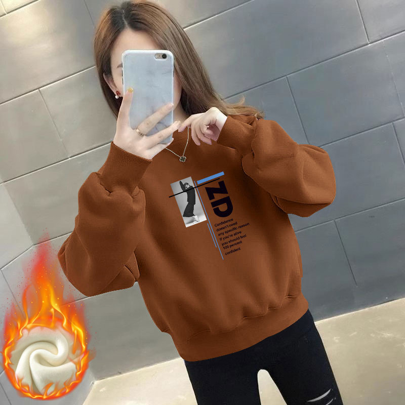 加绒保暖套头衫卫衣女款秋冬季加厚长袖圆领无帽复古休闲运动上衣