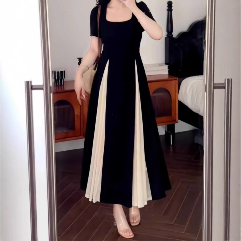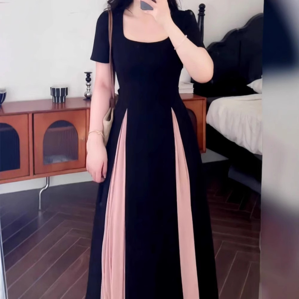 2025大码法式拼接别致连衣裙女夏季胖mm收腰气质小黑裙子优雅撞色