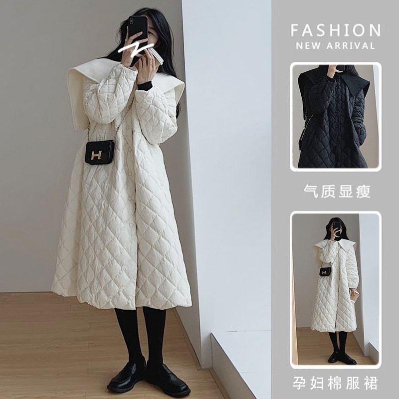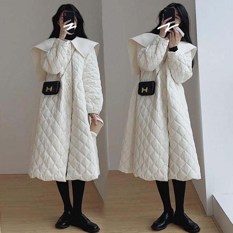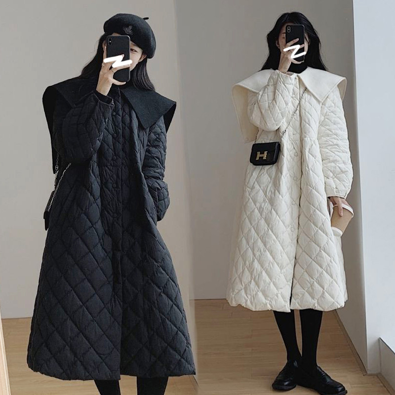 秋冬大码女装胖mm显瘦藏肉减龄娃娃领菱格棉服欧货长款棉衣裙外套