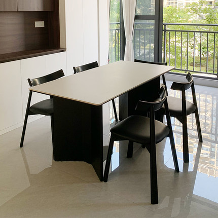 德利丰纯白岩板实木餐桌 长方形家用饭桌黑白色 胡桃木中古风桌子