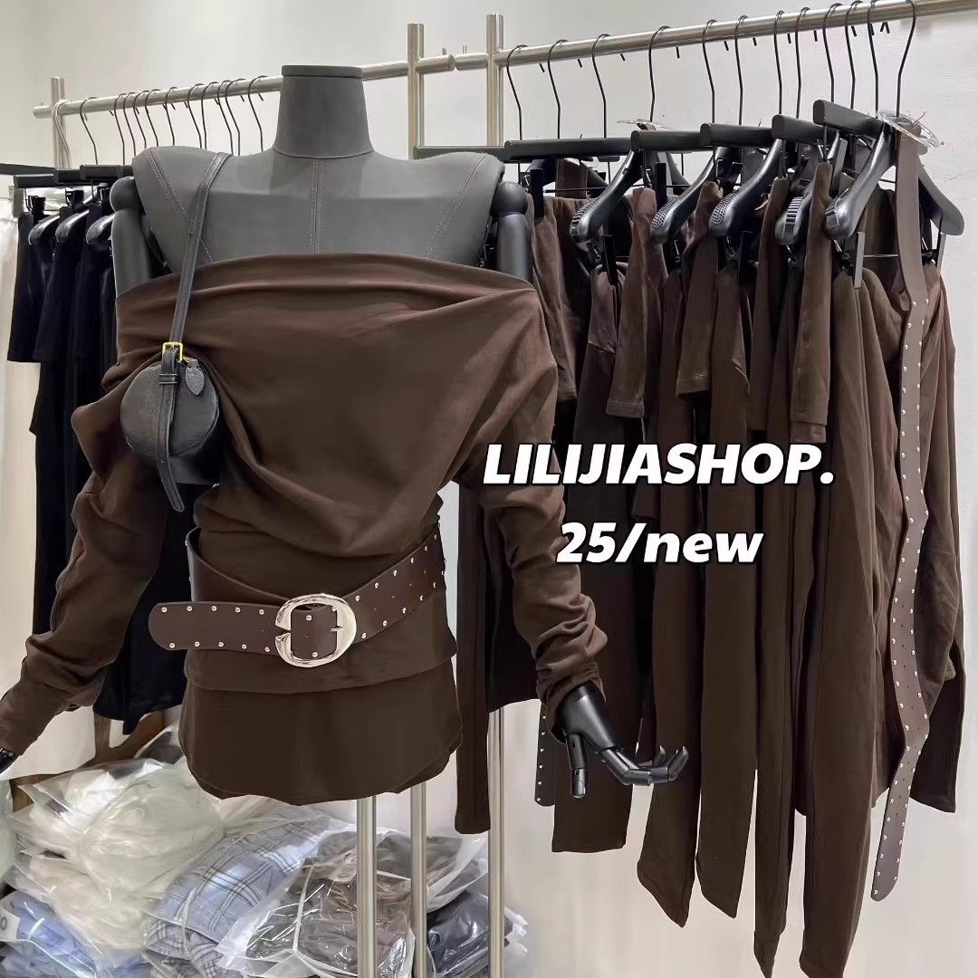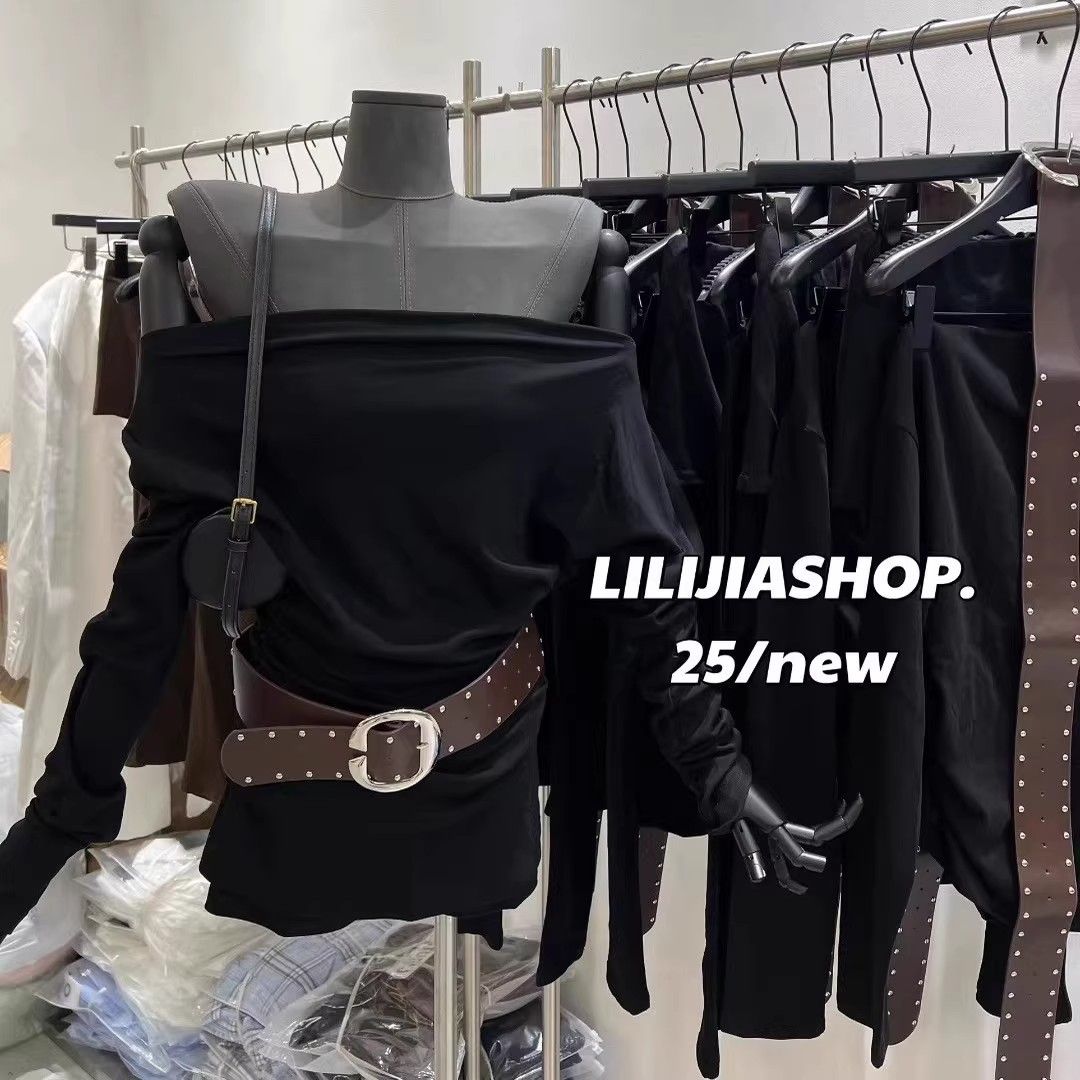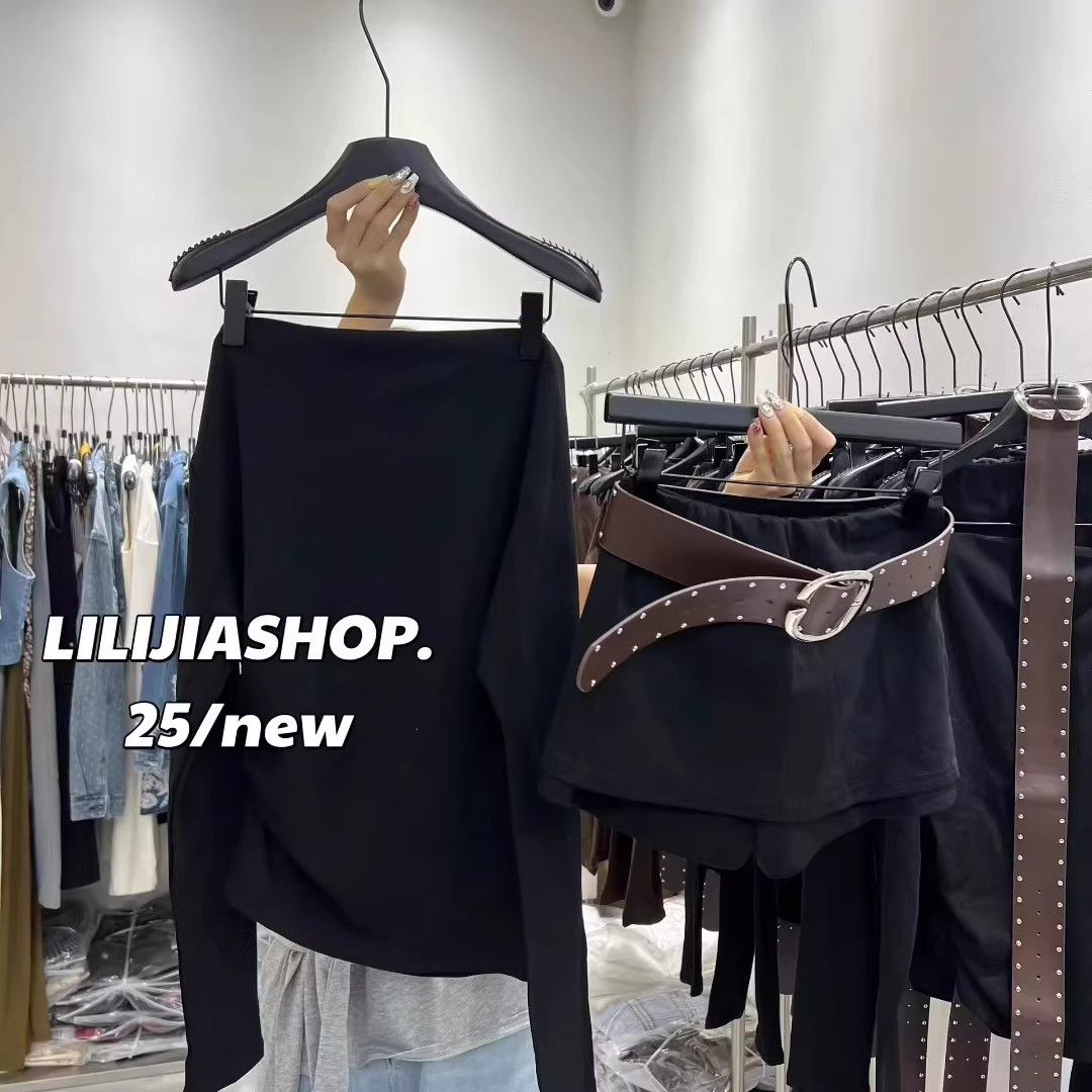纯欲风辣妹套装黑色一字领长袖T恤女秋季高腰休闲裤短裤子两件套
