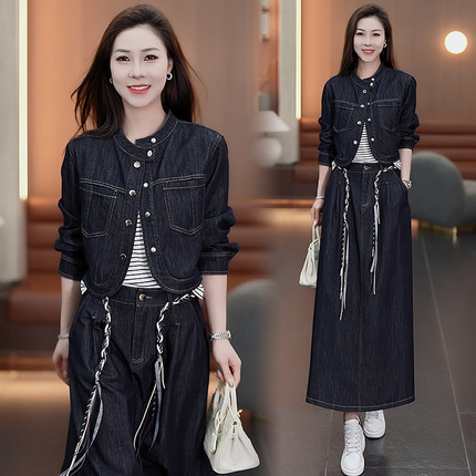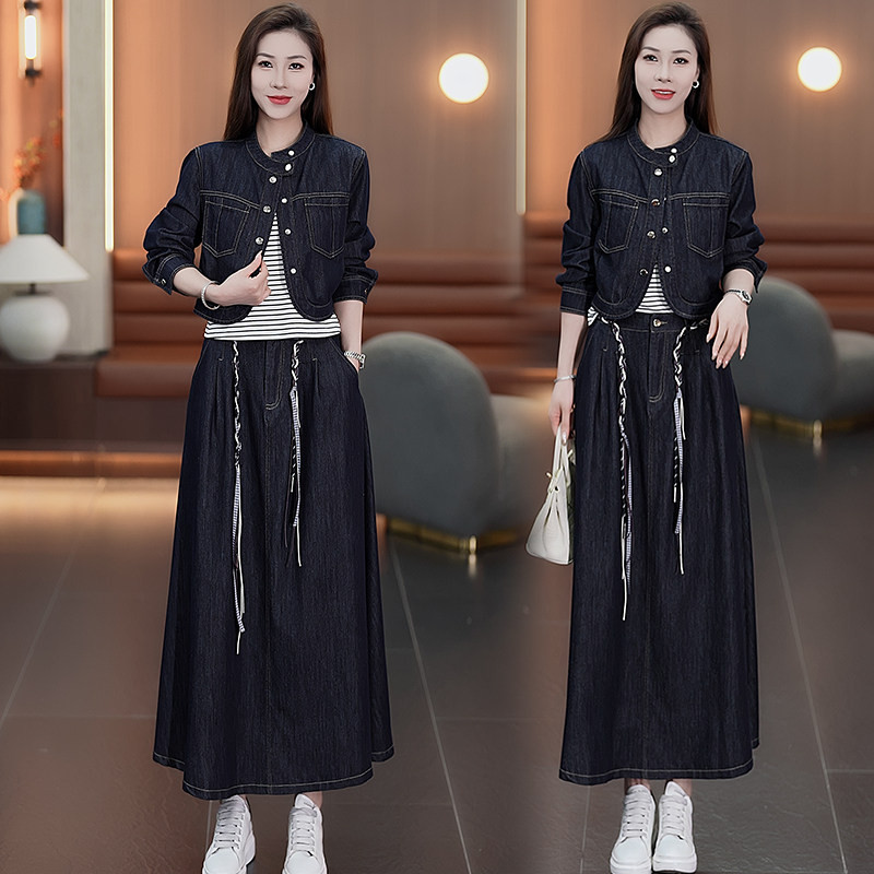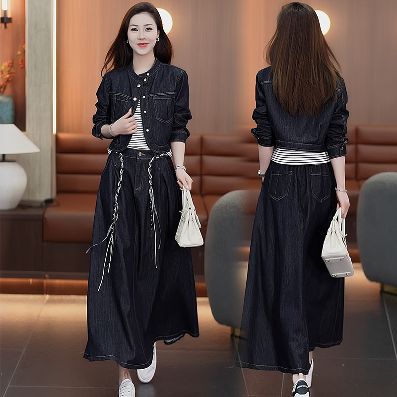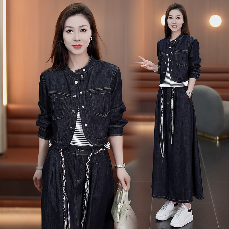 时尚牛仔套装裙女春季新款洋气质显瘦短外套条纹背心半身裙三件套