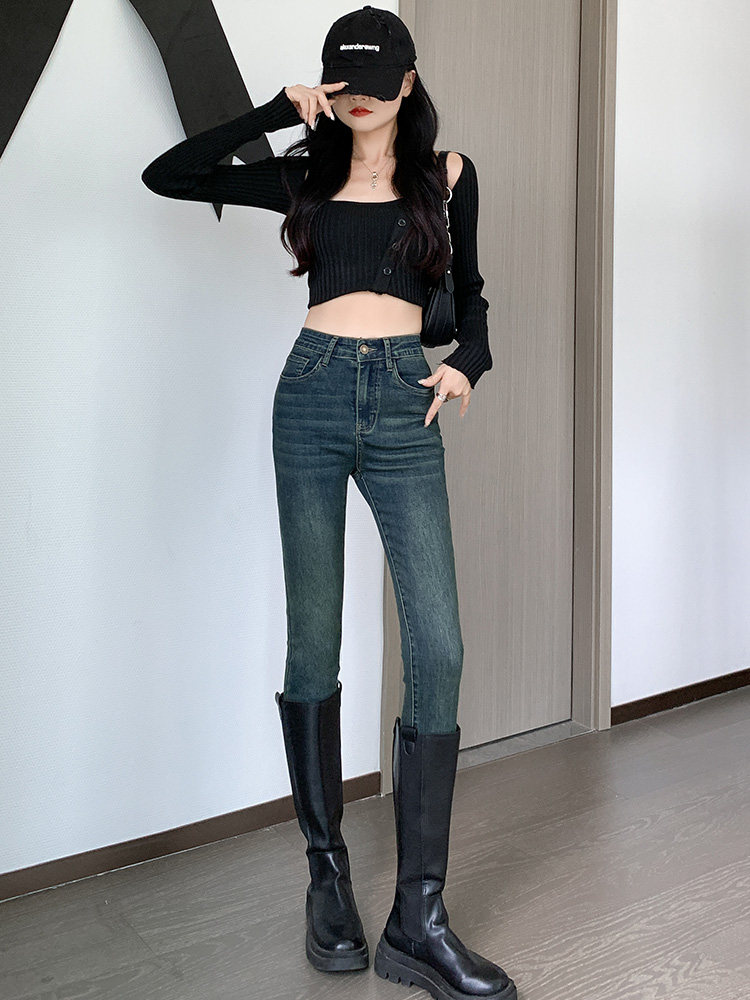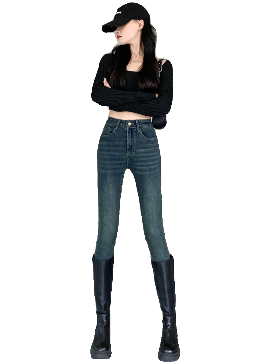 高腰紧身刺绣牛仔裤女2025年新款修身紧身显瘦小脚铅笔裤子长裤