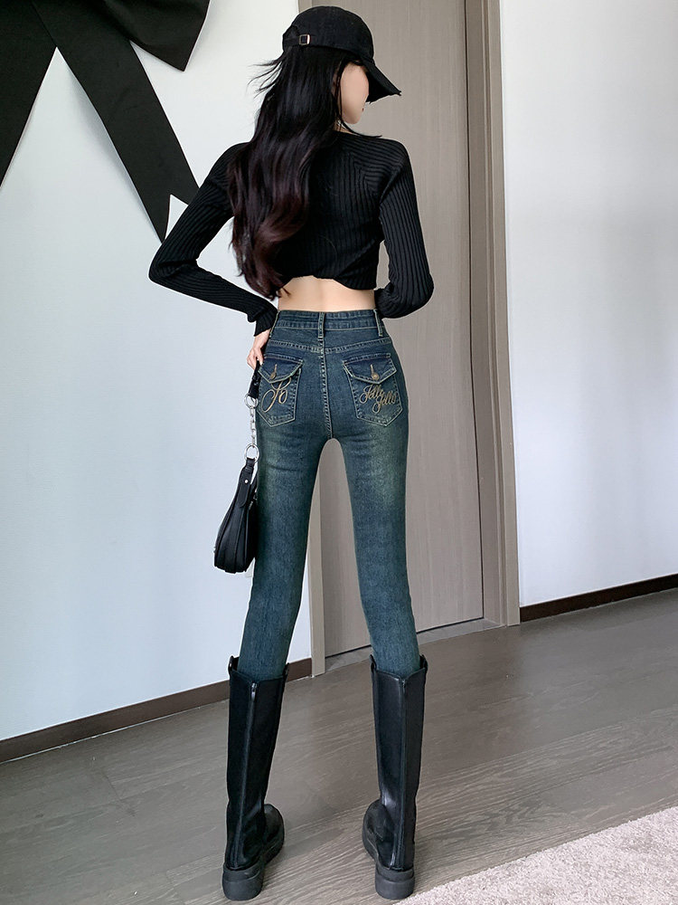 高腰紧身刺绣牛仔裤女小脚铅笔裤