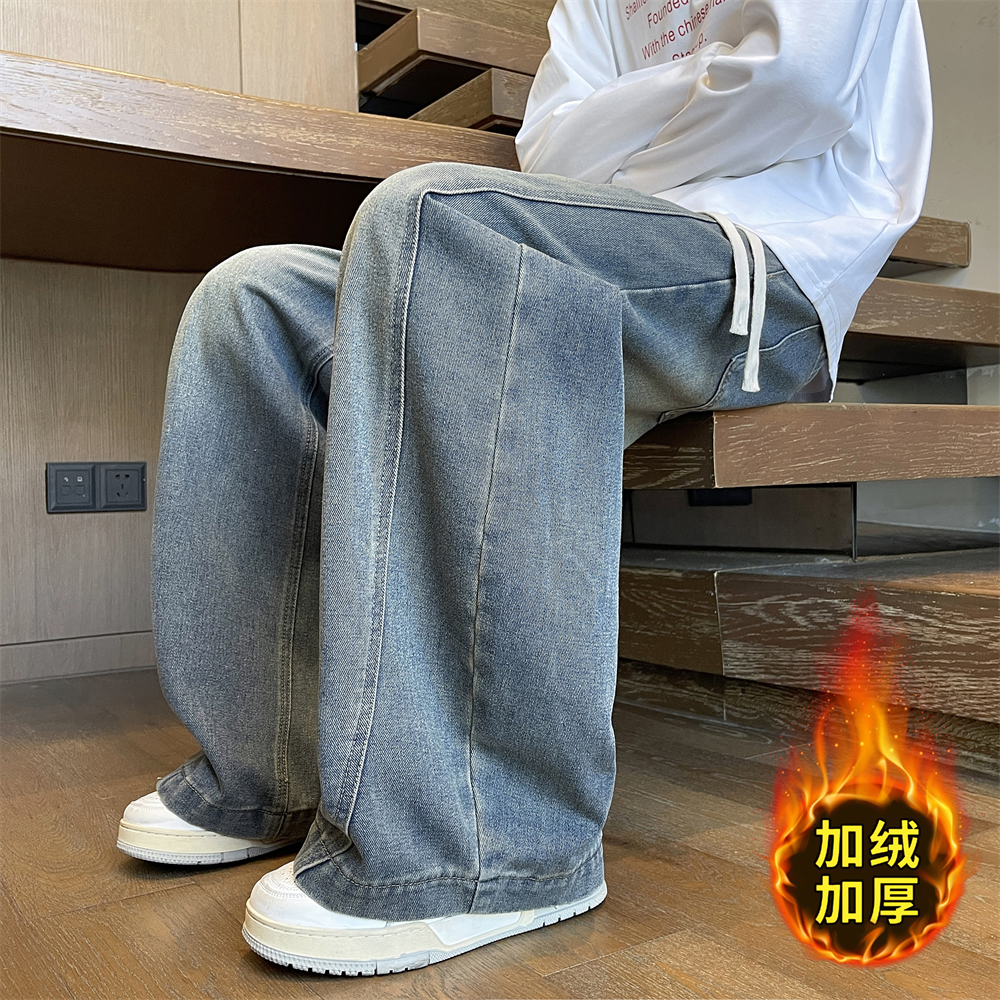 复古弯刀牛仔裤男生秋冬季新款青少年阔腿加绒加厚休闲长裤子男装