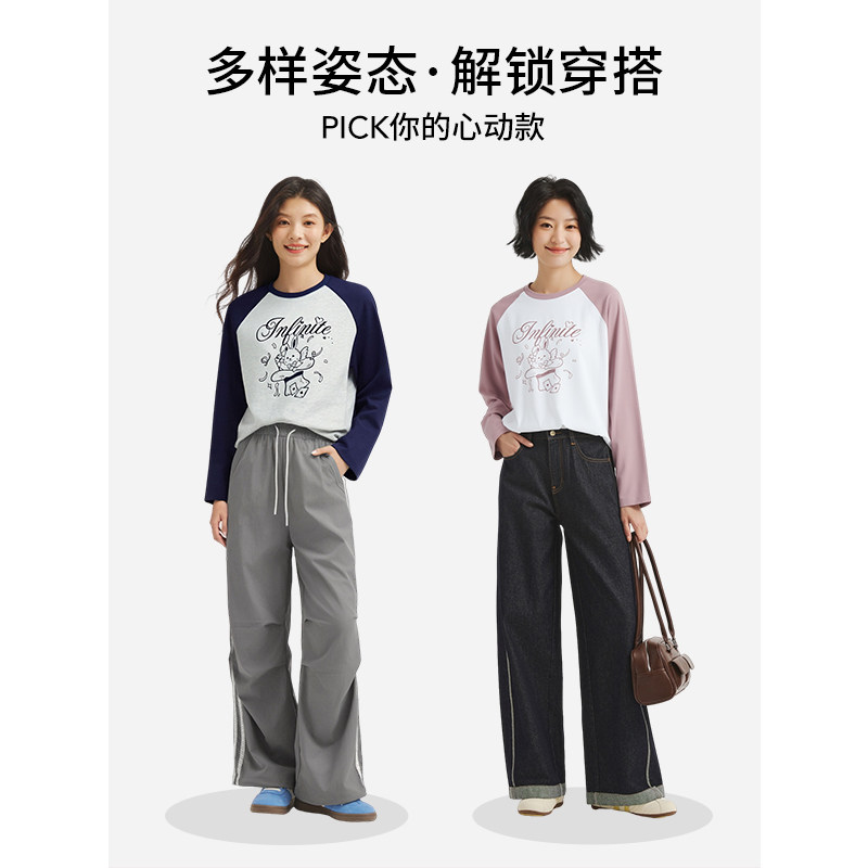 热风2026年春季新款女士插肩袖宽松纯棉长袖T棉感亲肤