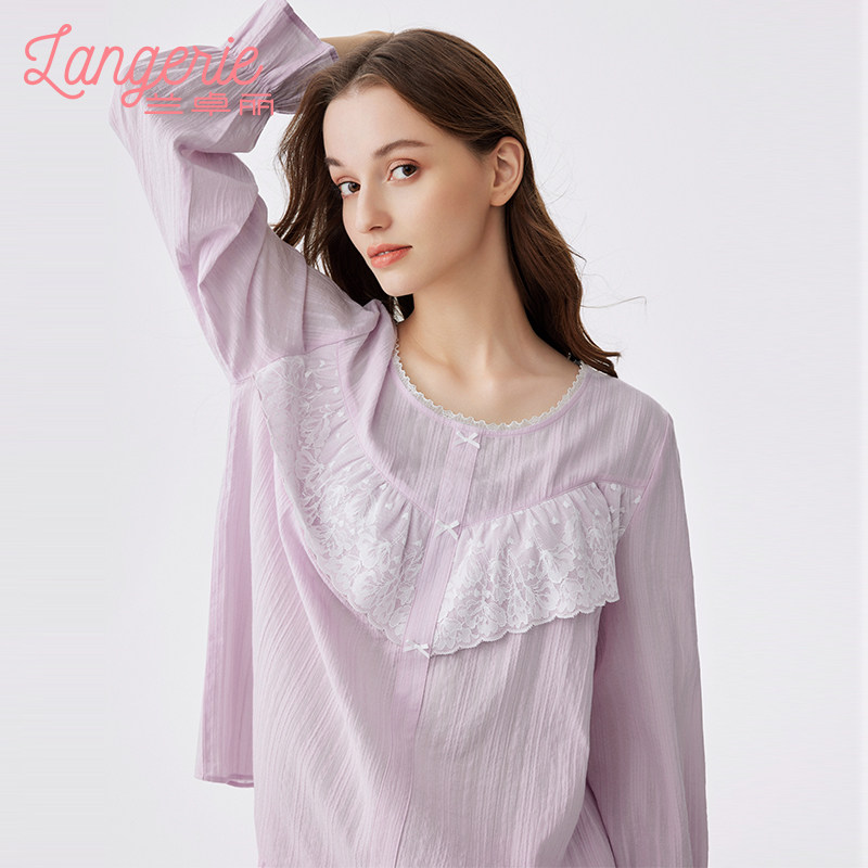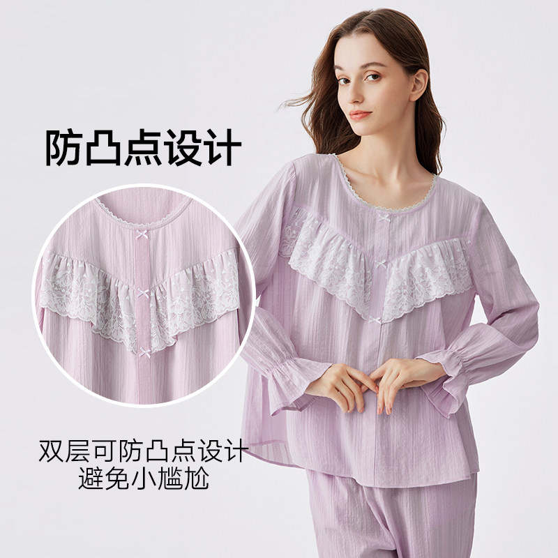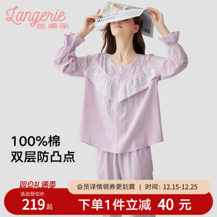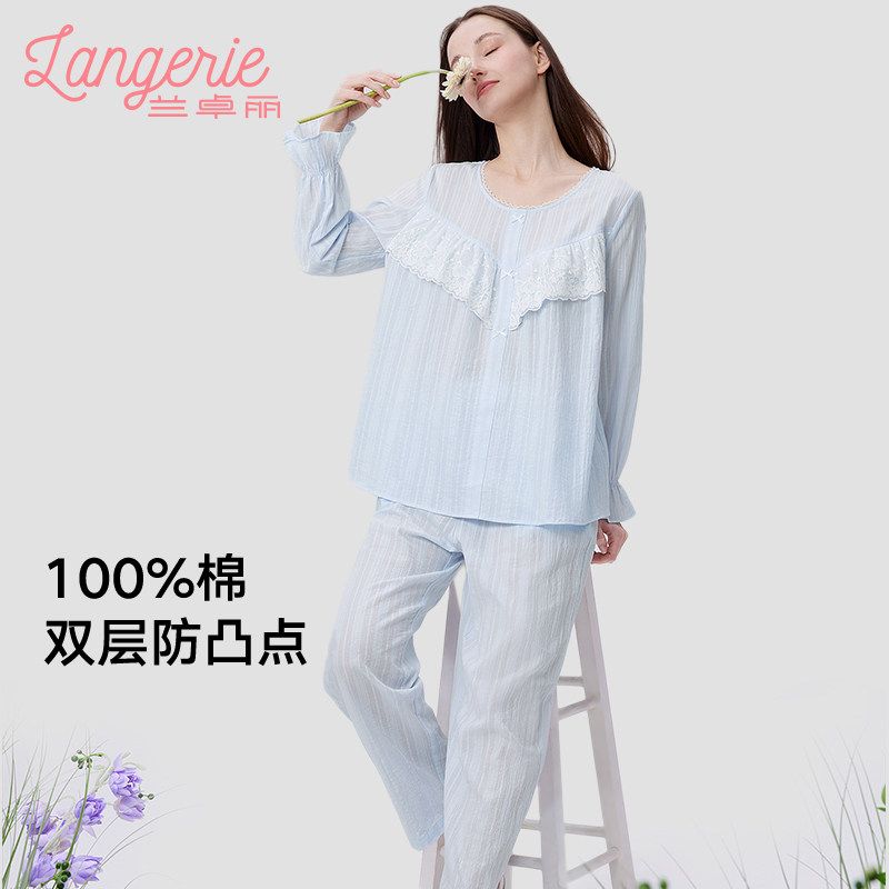 兰卓丽纯棉家居服女上下套装长袖长裤防凸点舒适透气睡衣可外穿薄