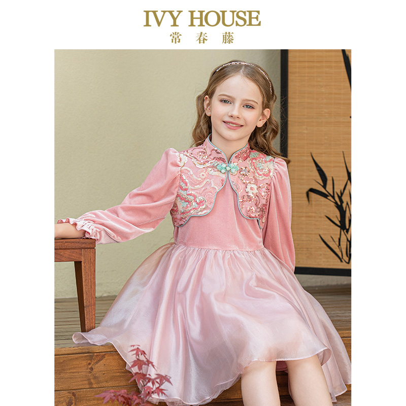 IVY HOUSE常春藤儿童装女童秋季新款 新中式国风假两件连衣裙丝绒