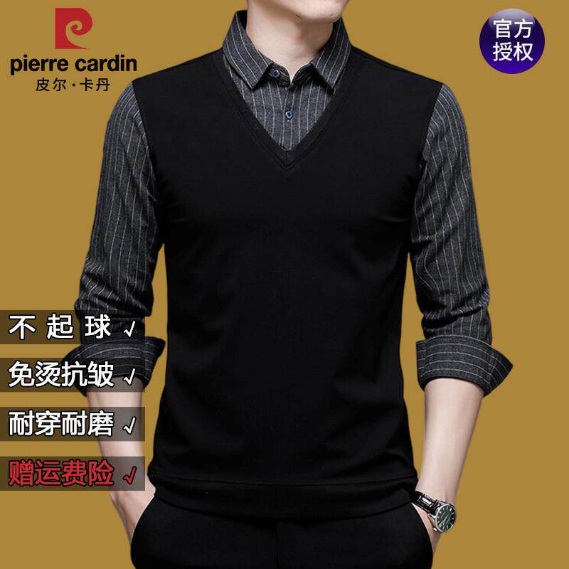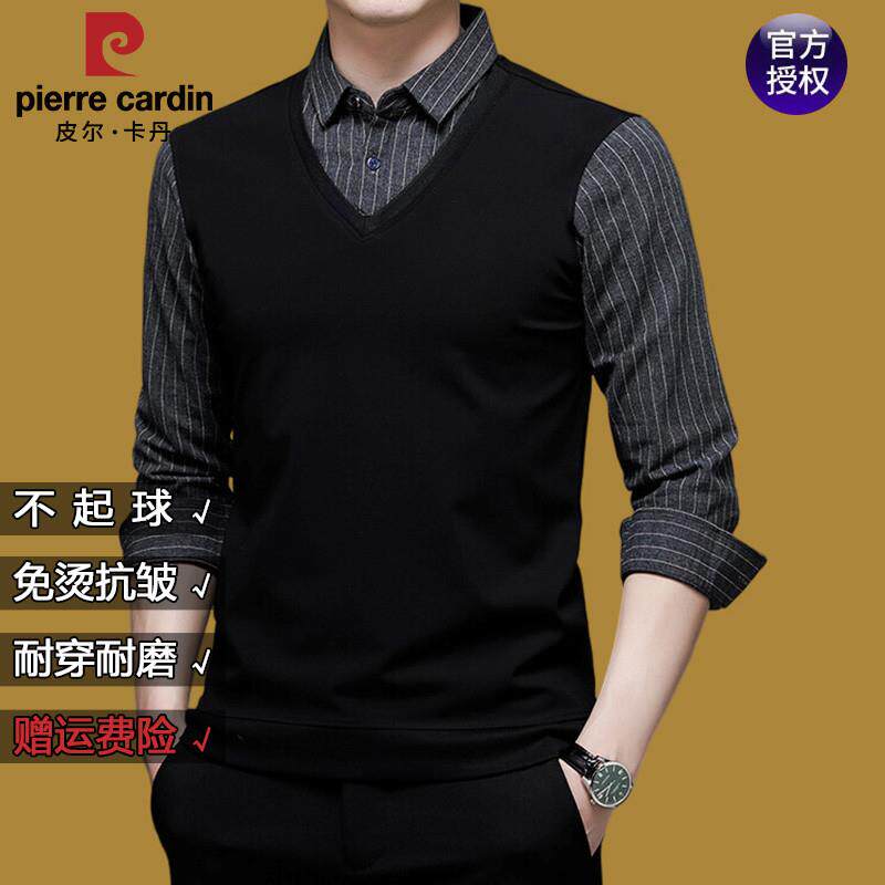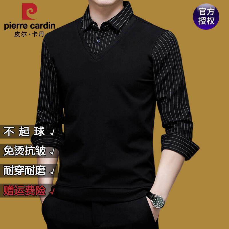 皮尔卡丹高档男士假两件长袖T恤衫秋冬季男士翻领条纹打底Polo衫