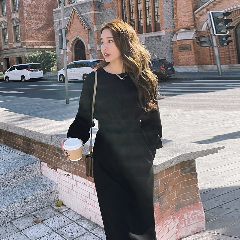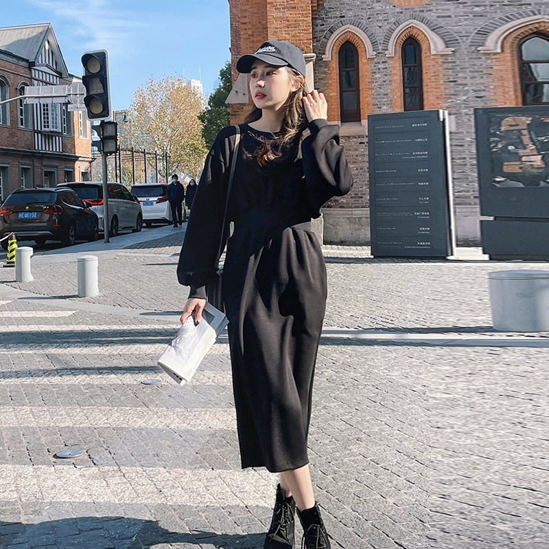 速发黑色卫衣连衣裙春秋收腰法式茶歇时级洋气休闲长袖裙子
