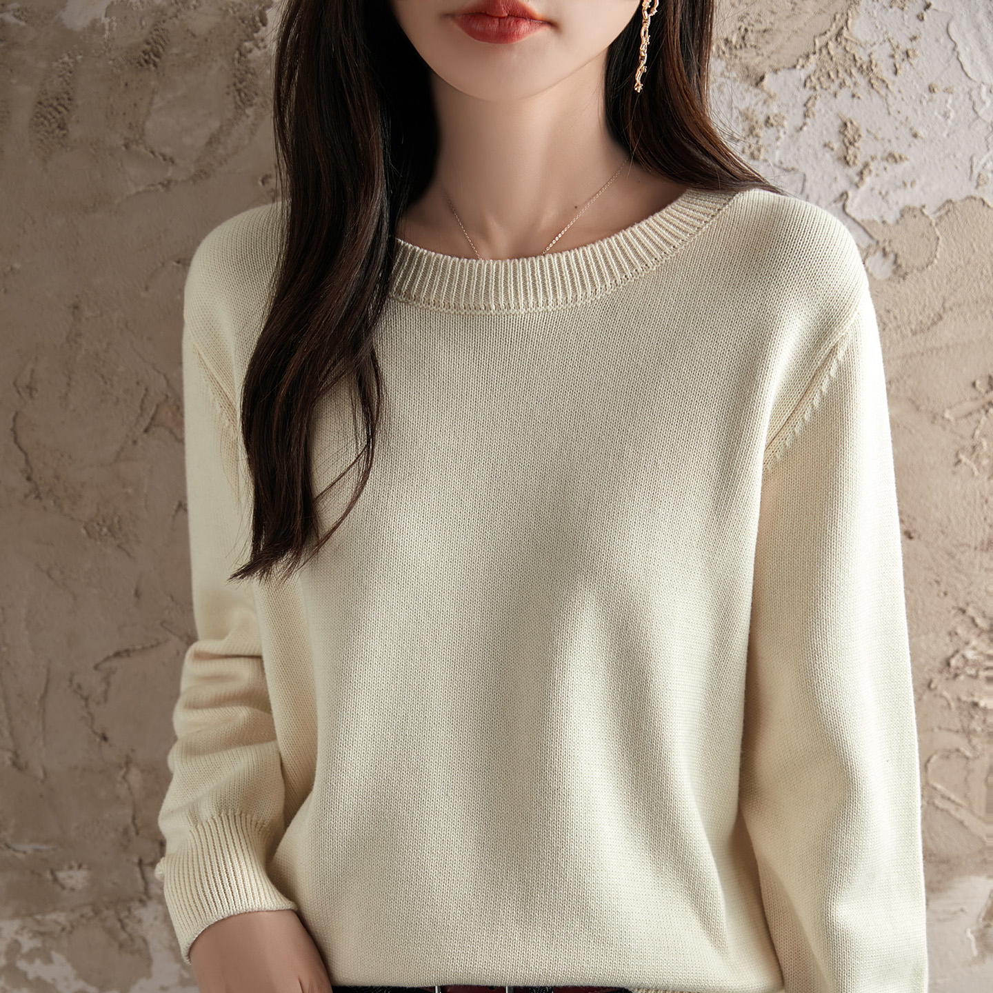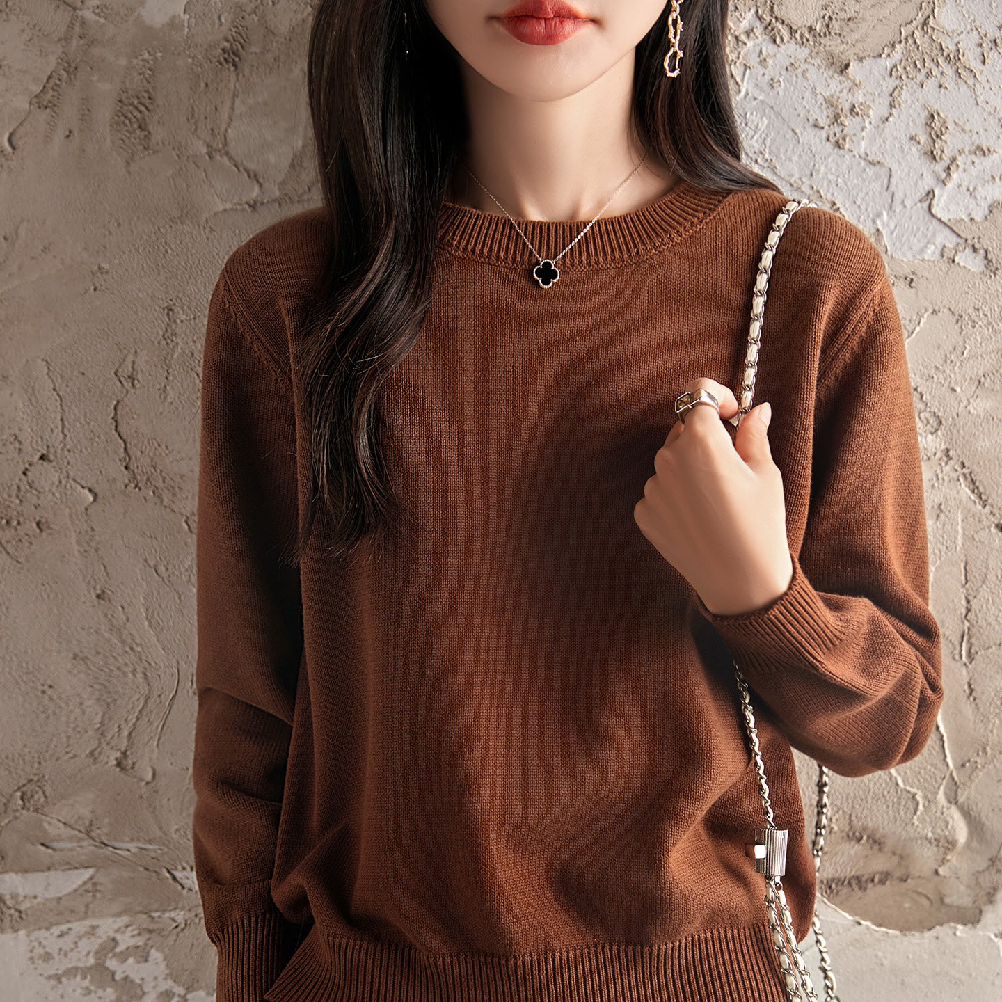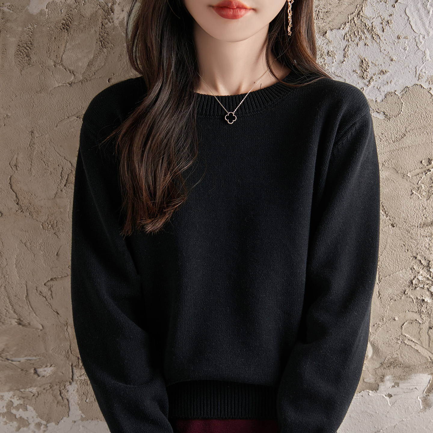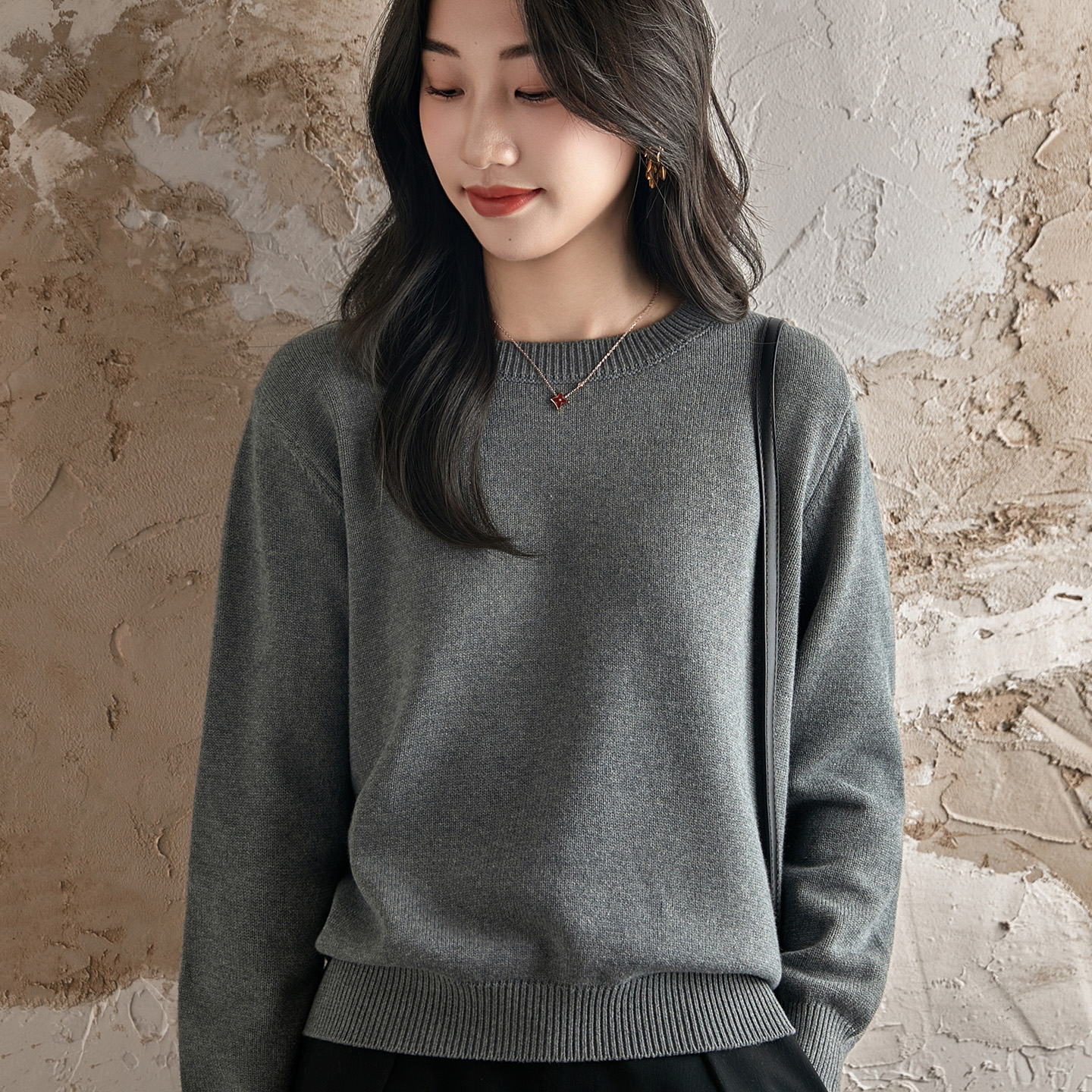 秋冬纯棉线七针加厚圆领毛衣女宽松百搭长袖打底针织衫保暖上衣