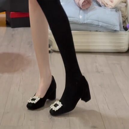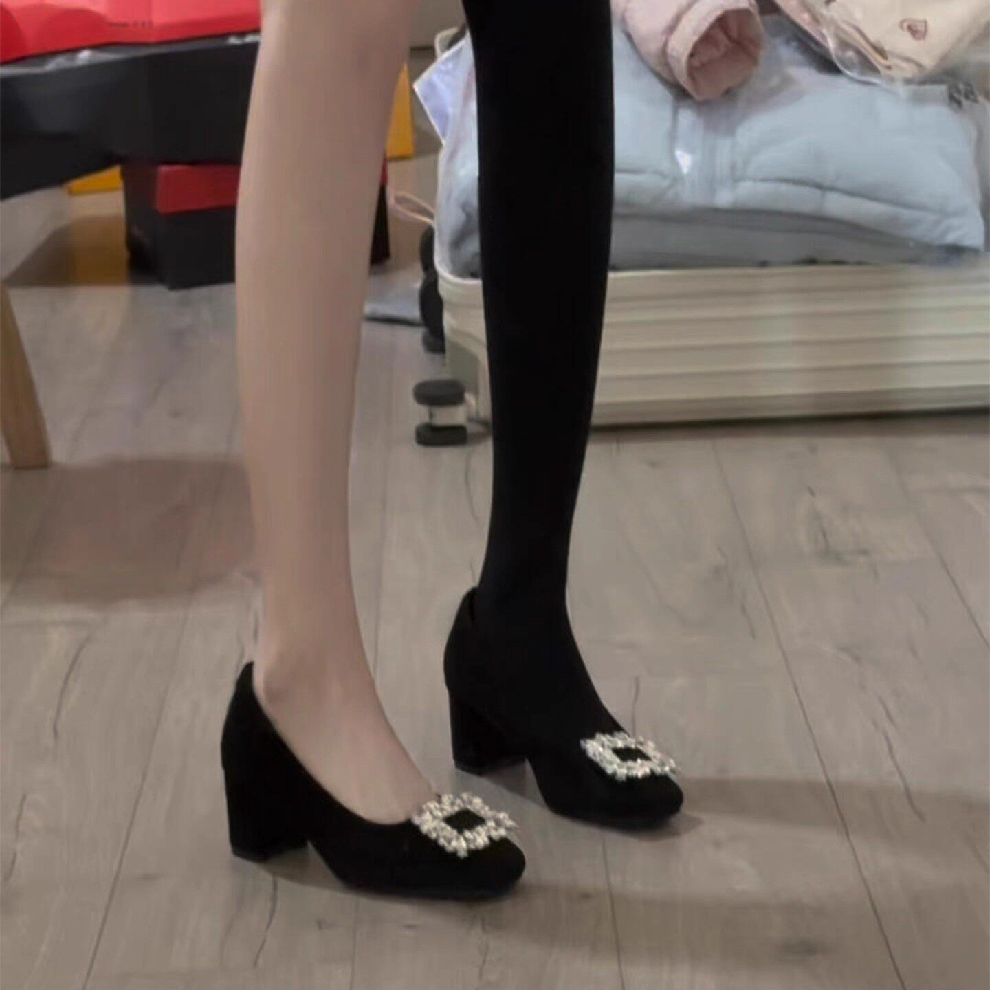 小个子内增高7cm粗跟方头水钻单鞋女通勤气质玛丽珍晚晚粗跟鞋子