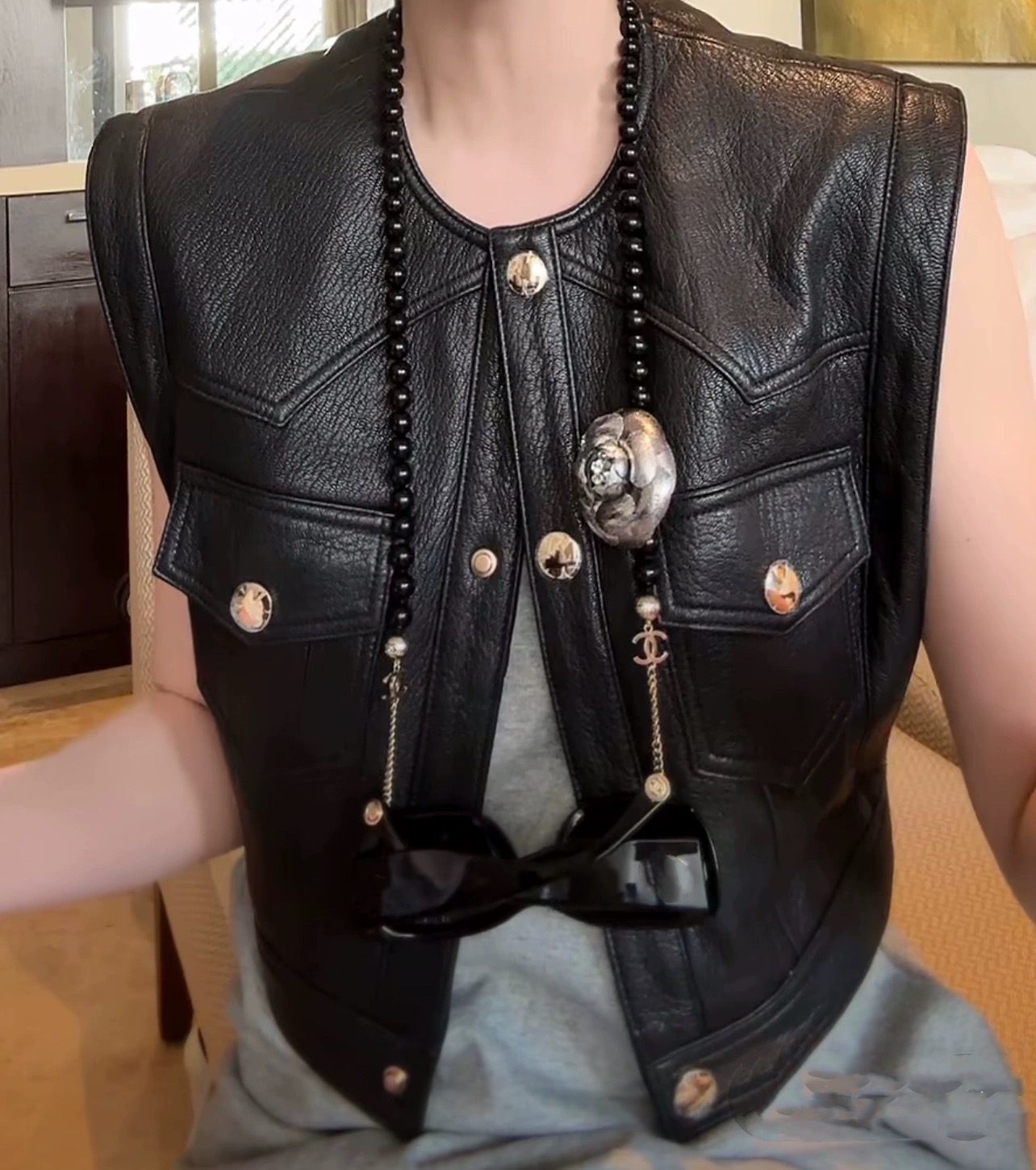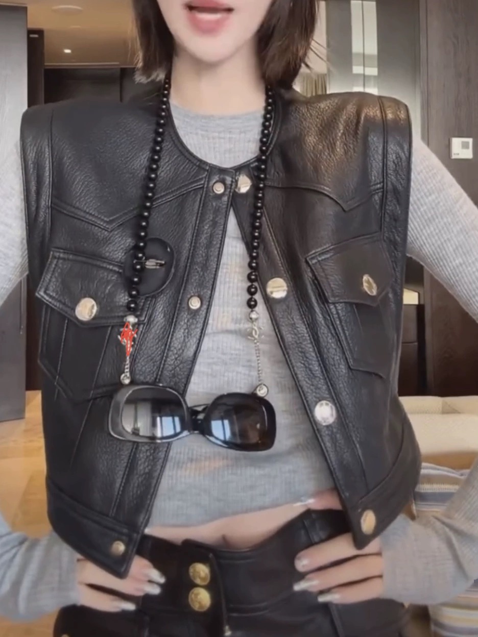 陈太太同款真皮口袋马夹女款纽扣绵羊皮机车宽松坎肩无袖皮衣马甲