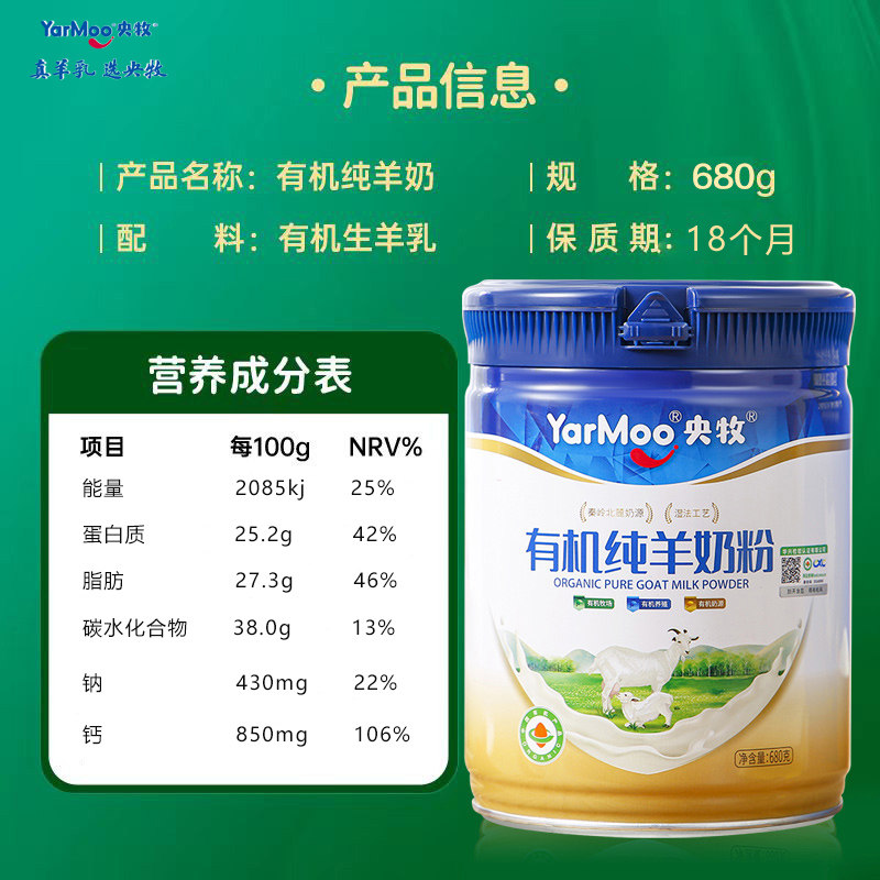 央牧有机纯羊奶粉高钙零添加无蔗糖成人中老年儿童青少年女士奶粉