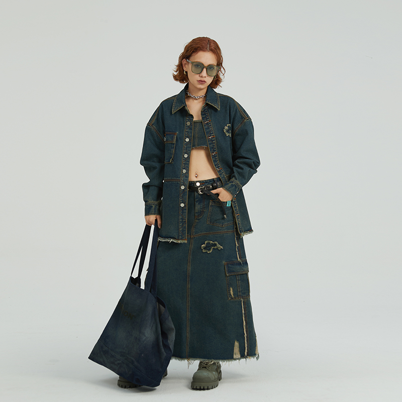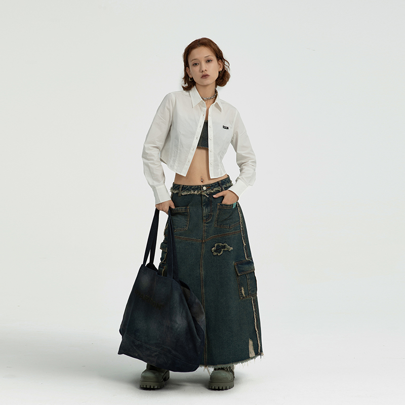 APPARITION 牛仔半身长裙 重水洗做旧猫须 多口袋设计