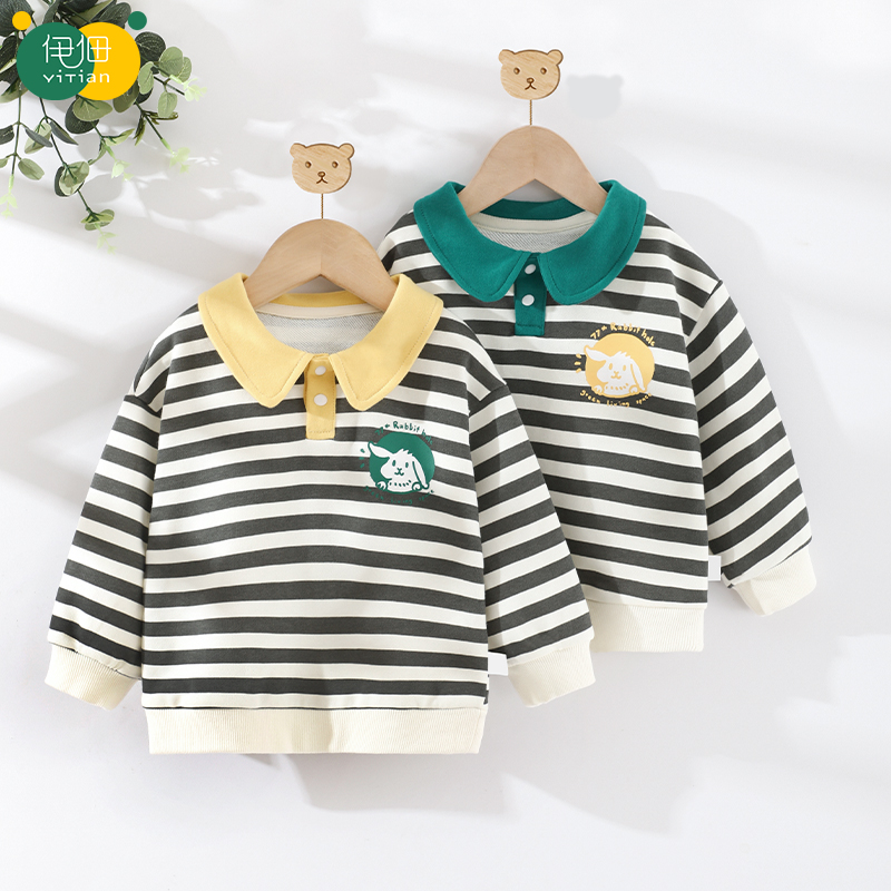 春秋男童牛奶丝翻领条纹儿童卫衣